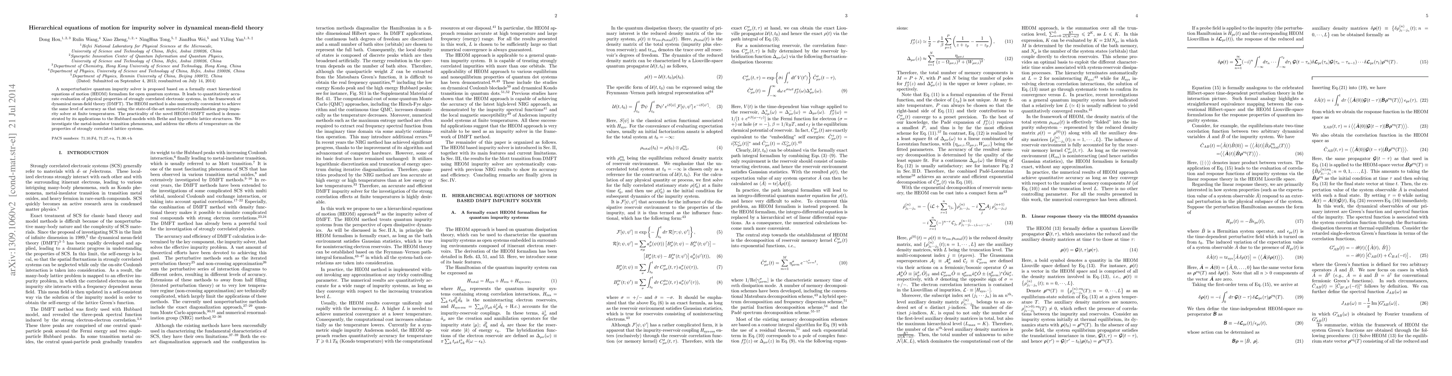 The paper proposes a novel nonperturbative quantum impurity solver using hierarchical equations of motion (HEOM) within dynamical mean-field theory (DMFT) for open quantum systems, demonstrating accuracy comparable to state-of-the-art methods and applying it to Hubbard models to study metal-insulator transitions and temperature effects.