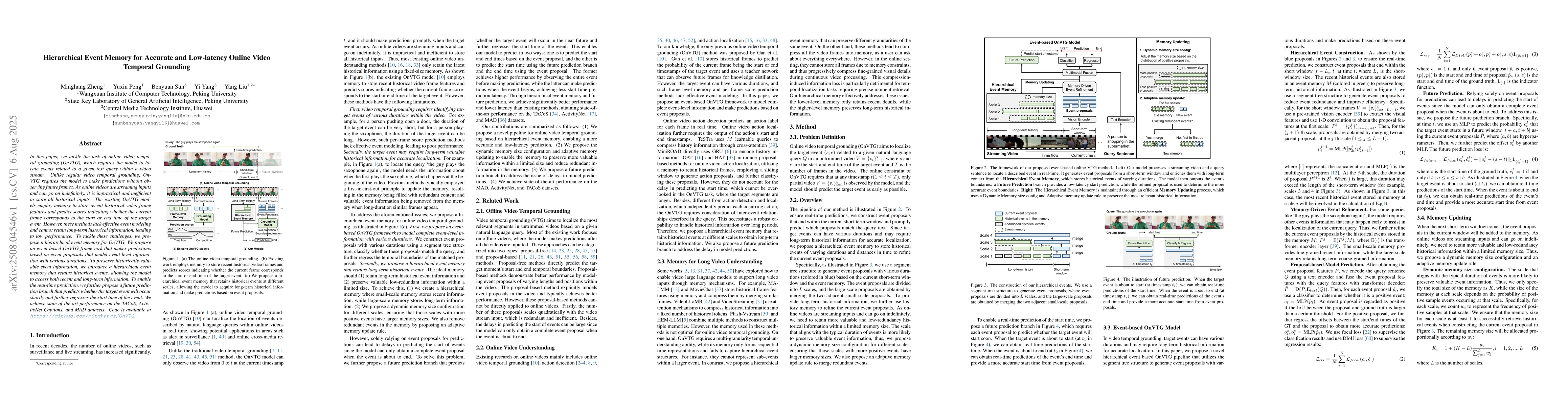 In this paper, we tackle the task of online video temporal grounding (OnVTG), which requires the model to locate events related to a given text query within a video stream. Unlike regular video temporal grounding, OnVTG requires the model to make predictions without observing future frames. As online videos are streaming inputs and can go on indefinitely, it is impractical and inefficient to store all historical inputs. The existing OnVTG models employ memory to store recent historical video frame features and predict scores indicating whether the current frame corresponds to the start or end time of the target event. However, these methods lack effective event modeling and cannot retain long-term historical information, leading to low performance. To tackle these challenges, we propose a hierarchical event memory for OnVTG. We propose an event-based OnVTG framework that makes predictions based on event proposals that model event-level information with various durations. To preserve historically valuable event information, we introduce a hierarchical event memory that retains historical events, allowing the model to access both recent and long-term information. To enable the real-time prediction, we further propose a future prediction branch that predicts whether the target event will occur shortly and further regresses the start time of the event. We achieve state-of-the-art performance on the TACoS, ActivityNet Captions, and MAD datasets. Code is available at https://github.com/minghangz/OnVTG.