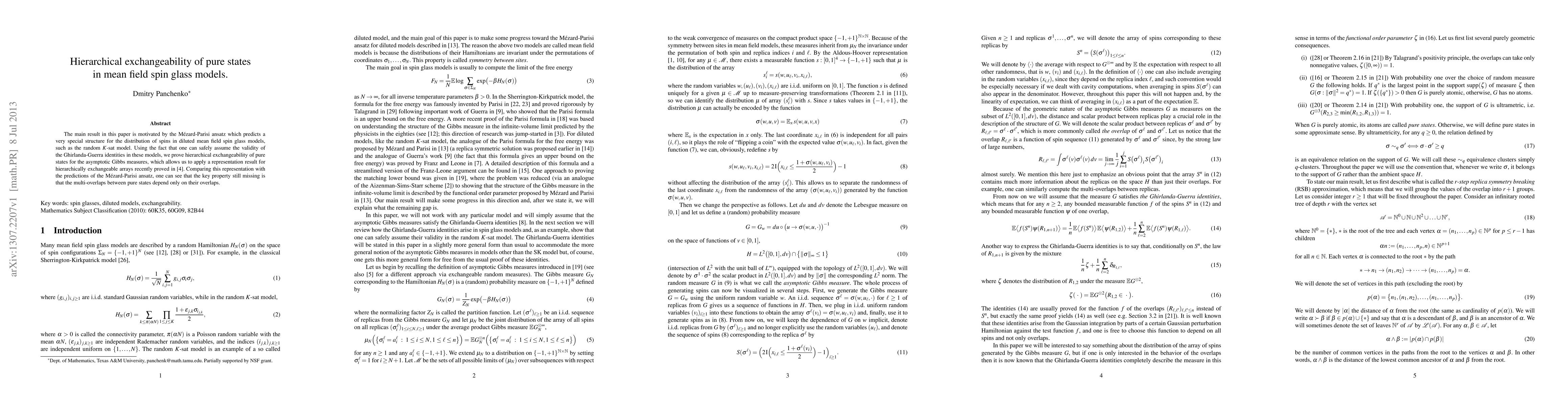This paper proves hierarchical exchangeability of pure states in mean field spin glass models, leveraging the Ghirlanda-Guerra identities and comparing results to the M\'ezard-Parisi ansatz, which highlights a missing key property: the multi-overlaps between pure states should depend solely on their overlaps.
