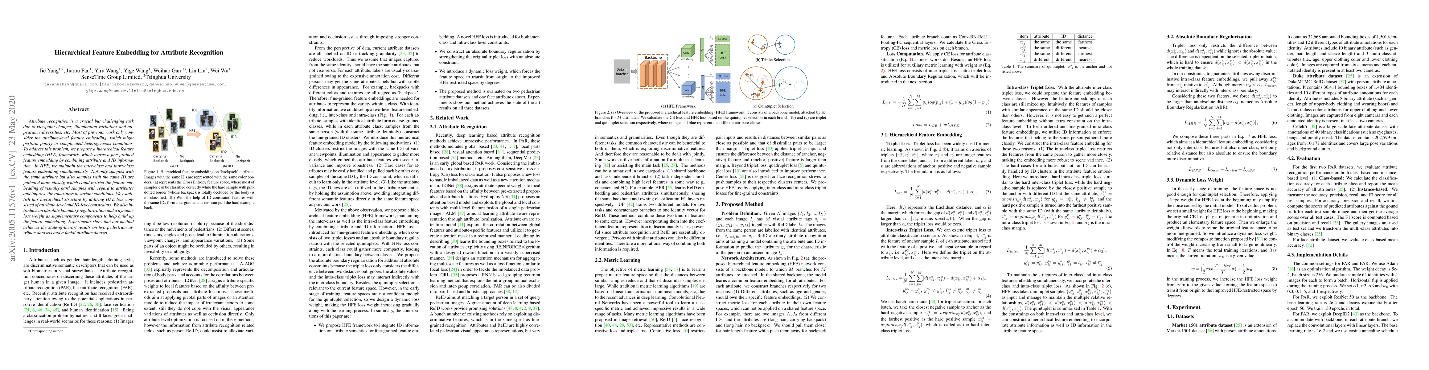 The paper proposes a hierarchical feature embedding (HFE) framework to enhance attribute recognition under challenging conditions by combining attribute and ID information, achieving state-of-the-art results on pedestrian and facial attribute datasets through inter-class and intra-class feature embeddings and supplementary loss components.