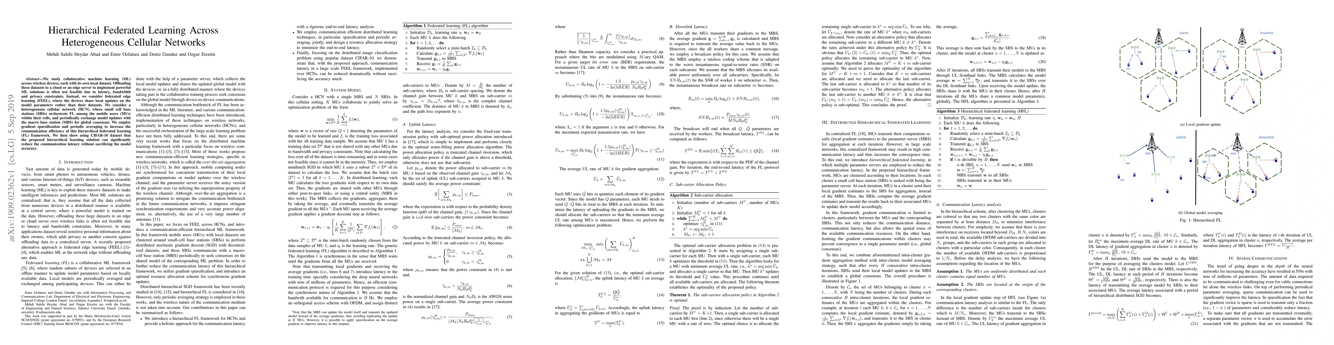 This paper proposes a hierarchical federated learning framework across heterogeneous cellular networks, where small cell base stations coordinate machine learning among mobile users, sharing model updates rather than data. The approach employs gradient sparsification and periodic averaging to enhance communication efficiency, demonstrating reduced latency and maintained model accuracy using the CIFAR-10 dataset.