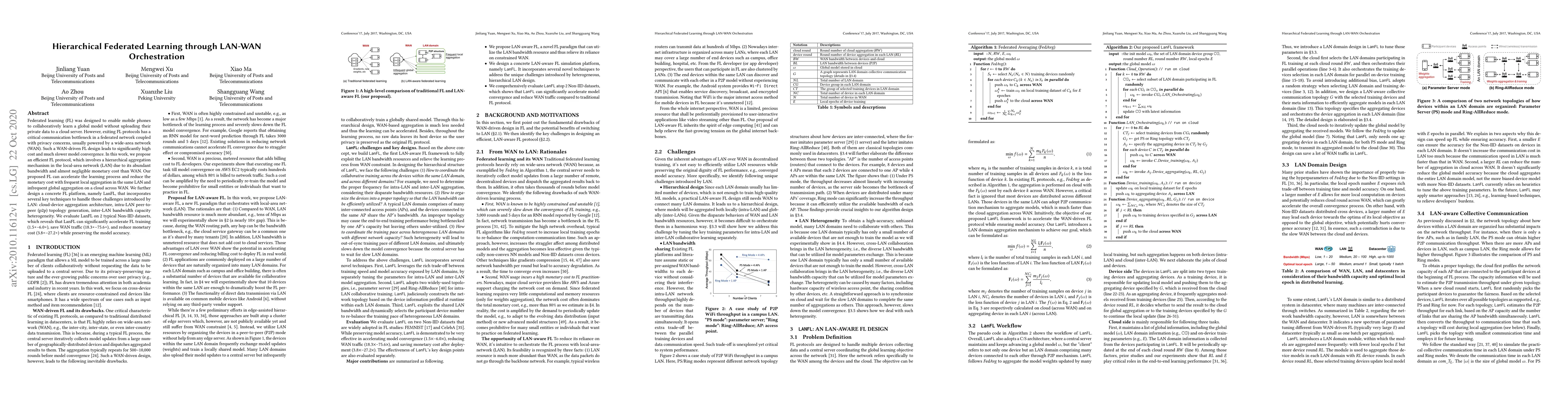 This paper proposes a hierarchical federated learning protocol that optimizes communication through local-area network (LAN) aggregation to reduce costs and accelerate model convergence, contrasting with traditional WAN-driven methods. LanFL, the developed platform, effectively manages LAN-specific challenges and demonstrates significant improvements in training speed, WAN traffic reduction, and cost savings while maintaining model accuracy.