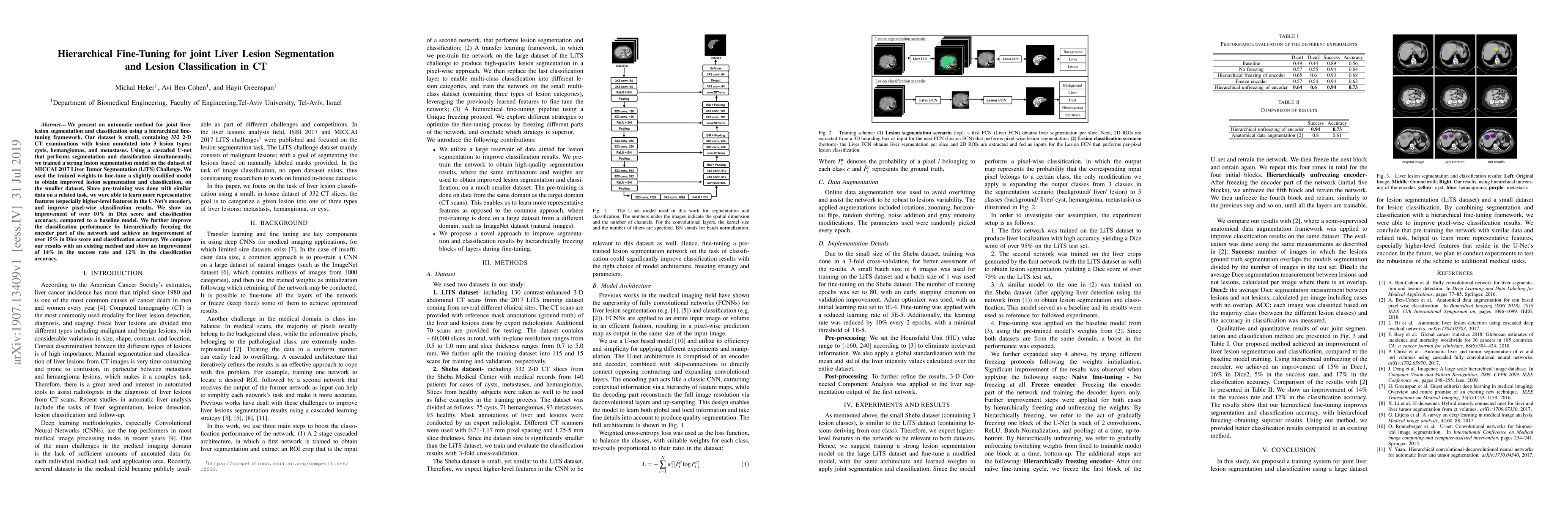 This paper proposes a hierarchical fine-tuning method for joint liver lesion segmentation and classification using a cascaded U-net. The approach improves segmentation and classification on a small dataset by leveraging pre-training on a larger related dataset, achieving over 10% improvement in Dice score and classification accuracy.
