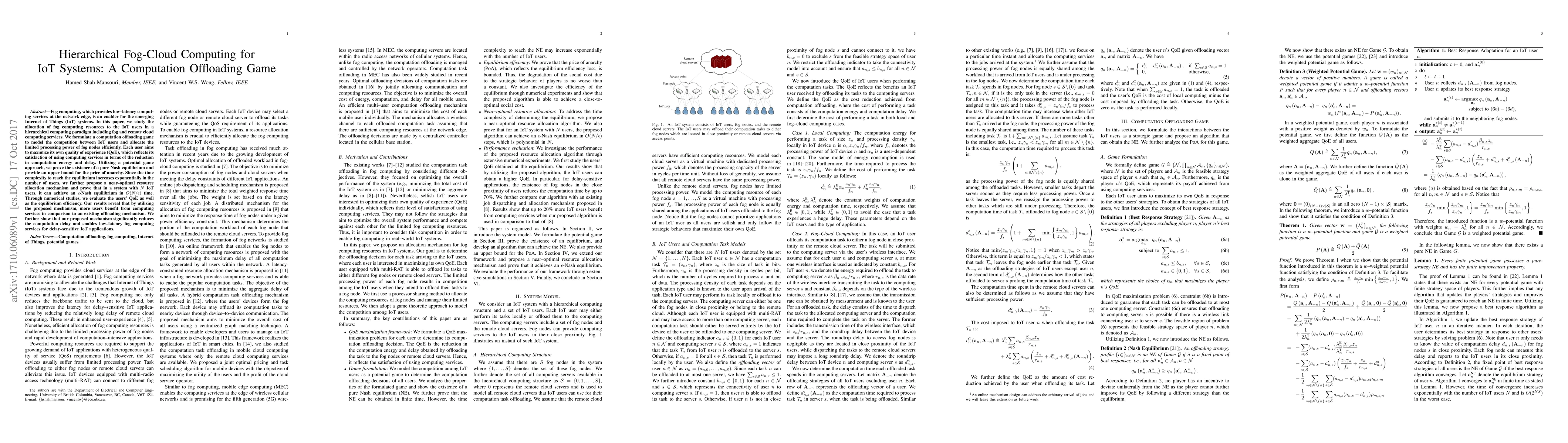 This paper explores a hierarchical fog-cloud computing model for IoT systems, formulating a computation offloading game to efficiently allocate fog resources. It achieves a near-optimal solution for resource allocation, significantly reducing computation delay and improving user quality of experience compared to existing methods.