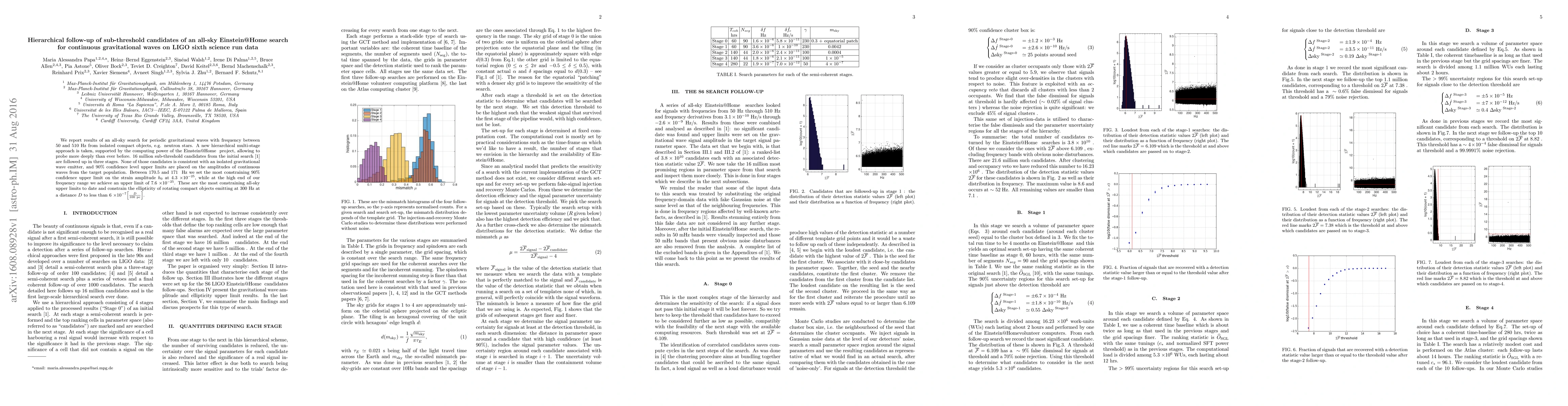 We report results of an all-sky search for periodic gravitational waves with frequency between 50 and 510 Hz from isolated compact objects, i.e. neutron stars. A new hierarchical multi-stage approach is taken, supported by the computing power of the Einstein@Home project, allowing to probe more deeply than ever before. 16 million sub-threshold candidates from the initial search [LVC,arXiv:1606.09619] are followed up in three stages. None of those candidates is consistent with an isolated gravitational wave emitter, and 90% confidence level upper limits are placed on the amplitudes of continuous waves from the target population. Between 170.5 and 171 Hz we set the most constraining 90% confidence upper limit on the strain amplitude h0 at 4.3x10-25 , while at the high end of our frequency range we achieve an upper limit of 7.6x10-25. These are the most constraining all-sky upper limits to date and constrain the ellipticity of rotating compact objects emitting at 300 Hz at a distance D to less than 6x10-7 [d/100pc].