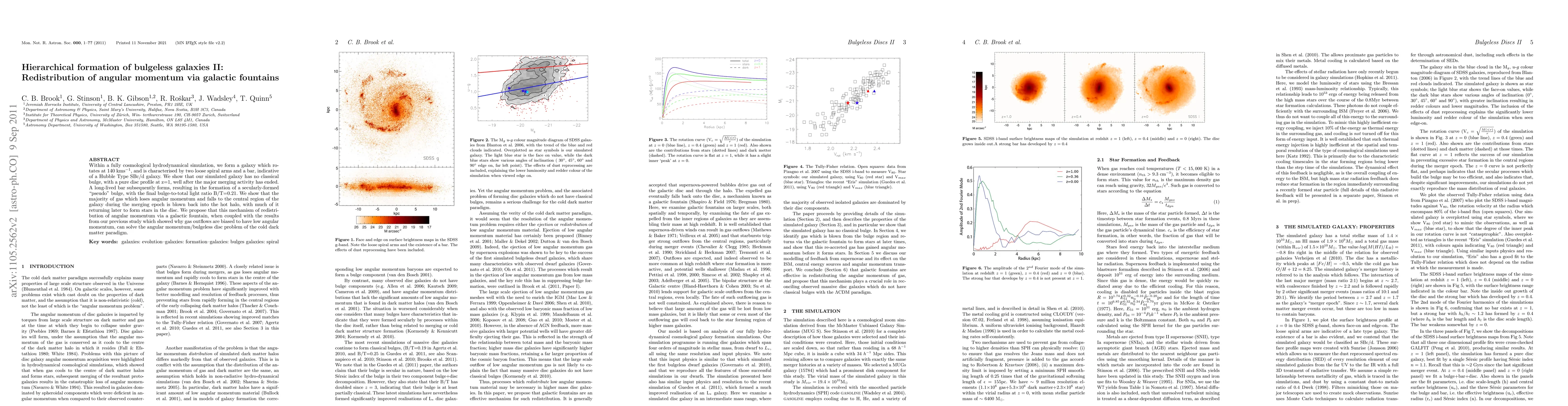 This paper presents a cosmological simulation of a bulgeless galaxy formed without major mergers, featuring a rotating disc with spiral arms and a bar. The study demonstrates that angular momentum redistribution via galactic fountains, where gas expelled during merging returns to form stars in the disc, explains the absence of a classical bulge and supports the formation of a pseudo bulge.