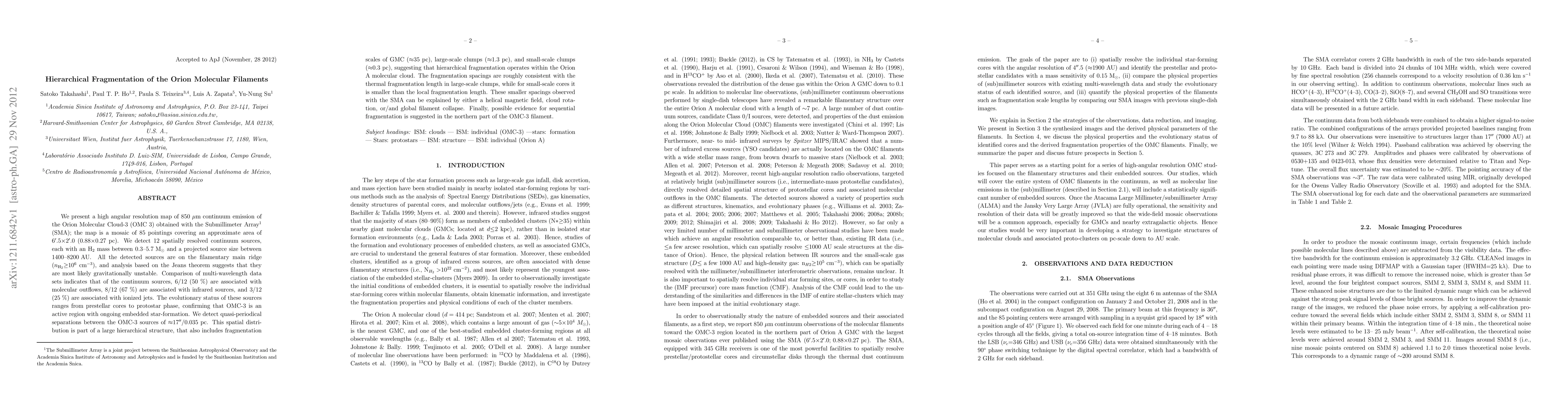 We present a high angular resolution map of 850 um continuum emission of the Orion Molecular Cloud-3 (OMC 3) obtained with the Submillimeter Array (SMA); the map is a mosaic of 85 pointings covering an approximate area of 6'.5 x 2'.0 (0.88 x 0.27 pc). We detect 12 spatially resolved continuum sources, each with an H_2 mass between 0.3-5.7 Mo and a projected source size between 1400-8200 AU. All the detected sources are on the filamentary main ridge n_H2>10^6 cm^-3), and analysis based on the Jeans theorem suggests that they are most likely gravitationally unstable. Comparison of multi-wavelength data sets indicates that of the continuum sources, 6/12 (50 %) are associated with molecular outflows, 8/12 (67 %) are associated with infrared sources, and 3/12 (25 %) are associated with ionized jets. The evolutionary status of these sources ranges from prestellar cores to protostar phase, confirming that OMC-3 is an active region with ongoing embedded star-formation. We detect quasi-periodical separations between the OMC-3 sources of ~17"/0.035 pc. This spatial distribution is part of a large hierarchical structure, that also includes fragmentation scales of GMC (~35 pc), large-scale clumps (~1.3 pc), and small-scale clumps (~0.3 pc), suggesting that hierarchical fragmentation operates within the Orion A molecular cloud. The fragmentation spacings are roughly consistent with the thermal fragmentation length in large-scale clumps, while for small-scale cores it is smaller than the local fragmentation length. These smaller spacings observed with the SMA can be explained by either a helical magnetic field, cloud rotation, or/and global filament collapse. Finally, possible evidence for sequential fragmentation is suggested in the northern part of the OMC-3 filament.