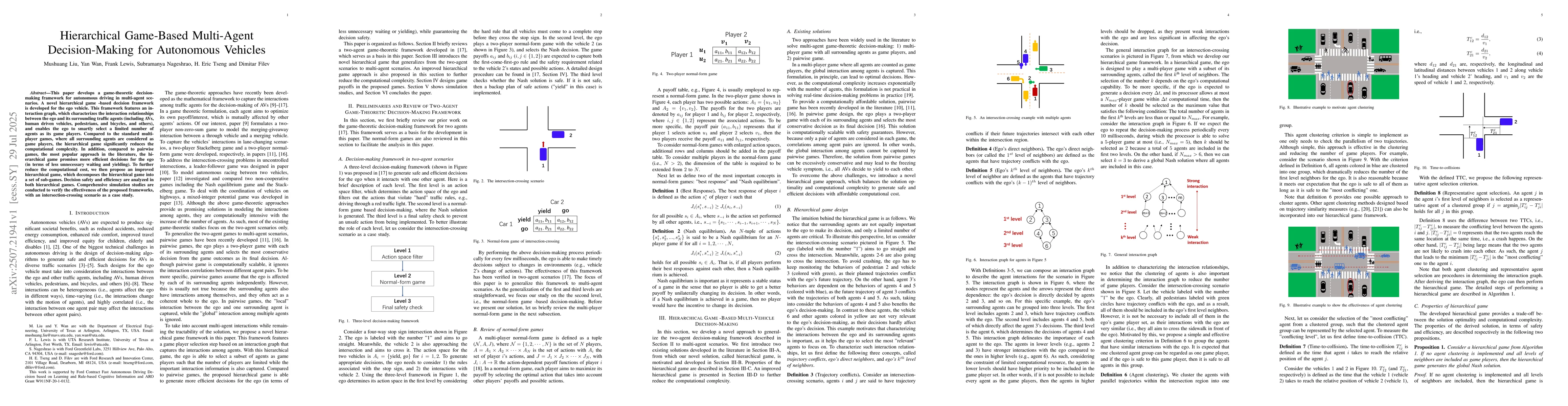 The paper develops a hierarchical game-theoretic decision-making framework for autonomous vehicles using an interaction graph to characterize relationships between ego and surrounding agents, reducing computational complexity compared to multi-player and pairwise games.