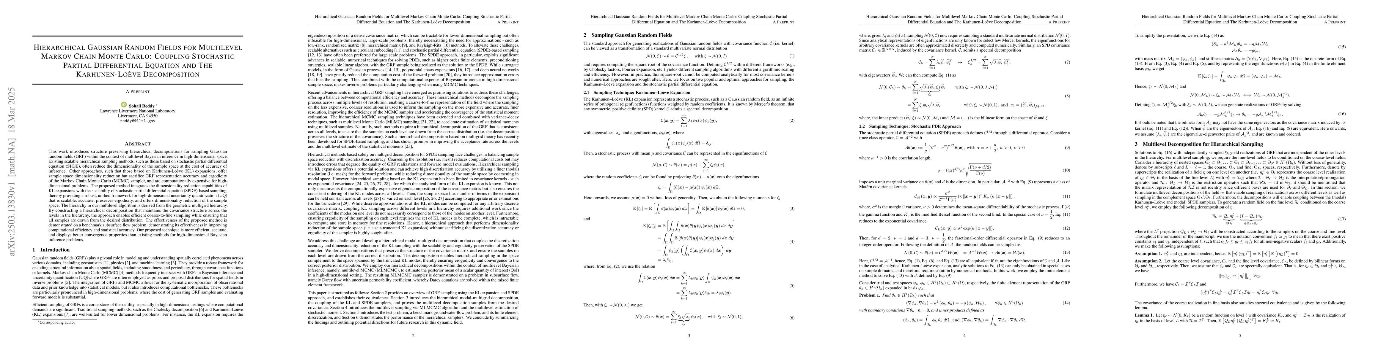 The paper introduces a hierarchical Gaussian random fields (GRF) sampling method for multilevel Markov Chain Monte Carlo (MCMC) that integrates stochastic partial differential equation (SPDE) and Karhunen-Loève (KL) decomposition, providing a scalable, accurate, ergodic, and dimensionality-reducing framework for high-dimensional uncertainty quantification (UQ).