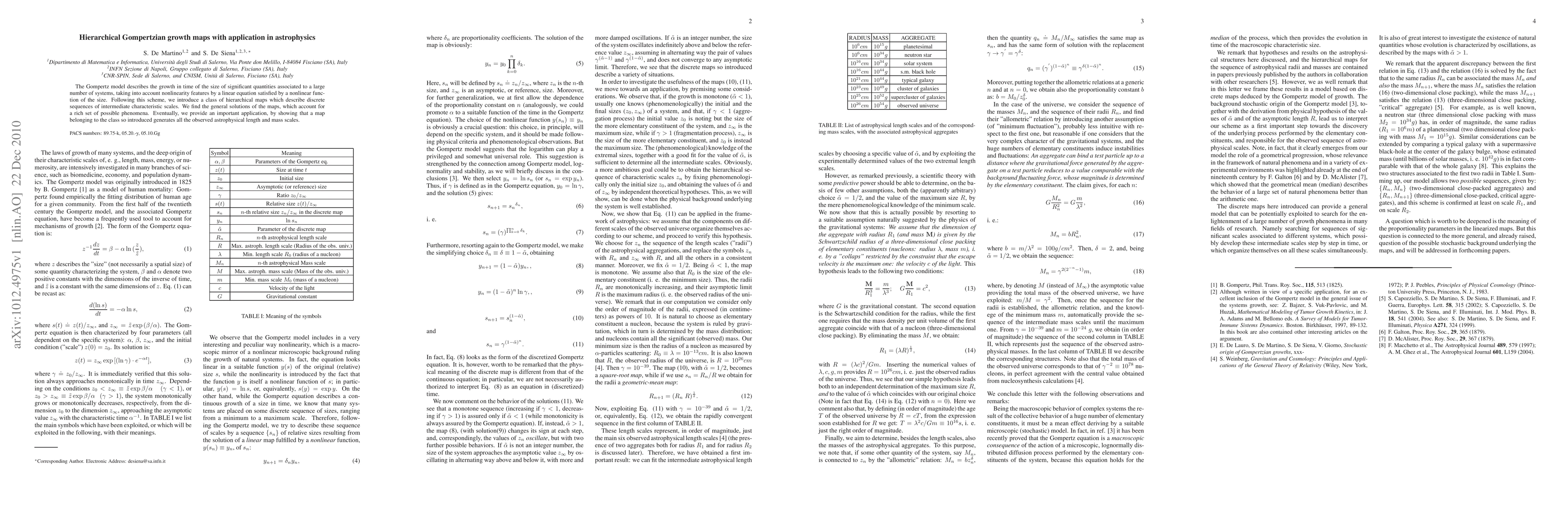 The Gompertz model describes the growth in time of the size of significant quantities associated to a large number of systems, taking into account nonlinearity features by a linear equation satisfied by a nonlinear function of the size. Following this scheme, we introduce a class of hierarchical maps which describe discrete sequences of intermediate characteristic scales. We find the general solutions of the maps, which account for a rich set of possible phenomena. Eventually, we provide an important application, by showing that a map belonging to the class so introduced generates all the observed astrophysical length and mass scales.
