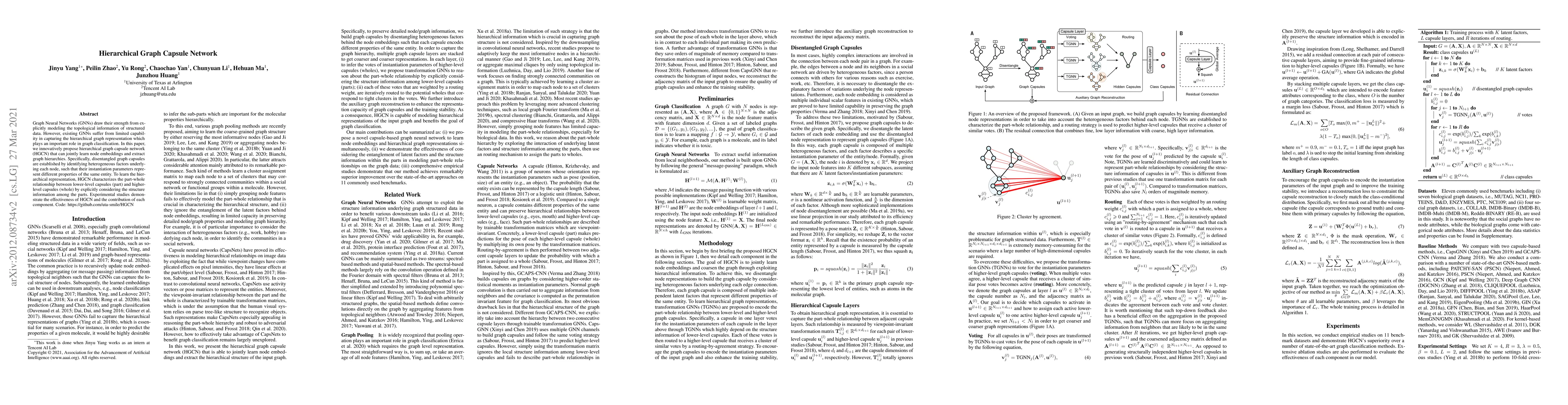 The paper proposes a hierarchical graph capsule network (HGCN) to enhance the capability of Graph Neural Networks (GNNs) in capturing hierarchical graph representations for graph classification. HGCN uses disentangled graph capsules to identify node properties and explicitly models part-whole relationships to learn hierarchical representations, demonstrating improved performance in experiments.
