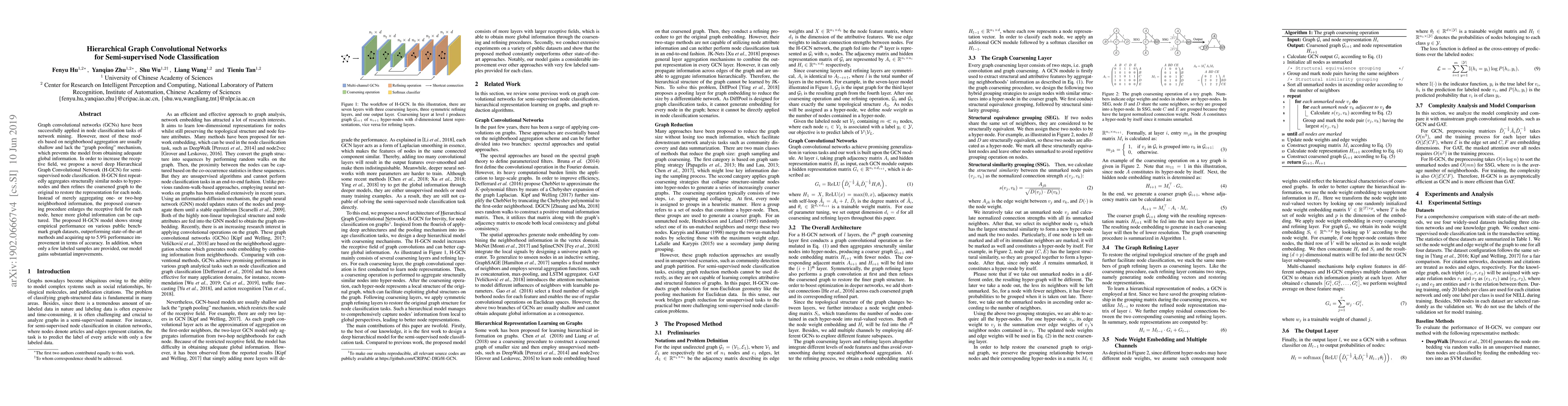 The paper proposes a Hierarchical Graph Convolutional Network (H-GCN) to enhance semi-supervised node classification by incorporating a graph pooling mechanism that aggregates structurally similar nodes into hyper-nodes, thereby enlarging the receptive field and capturing more global information. The model outperforms existing methods on benchmark datasets.