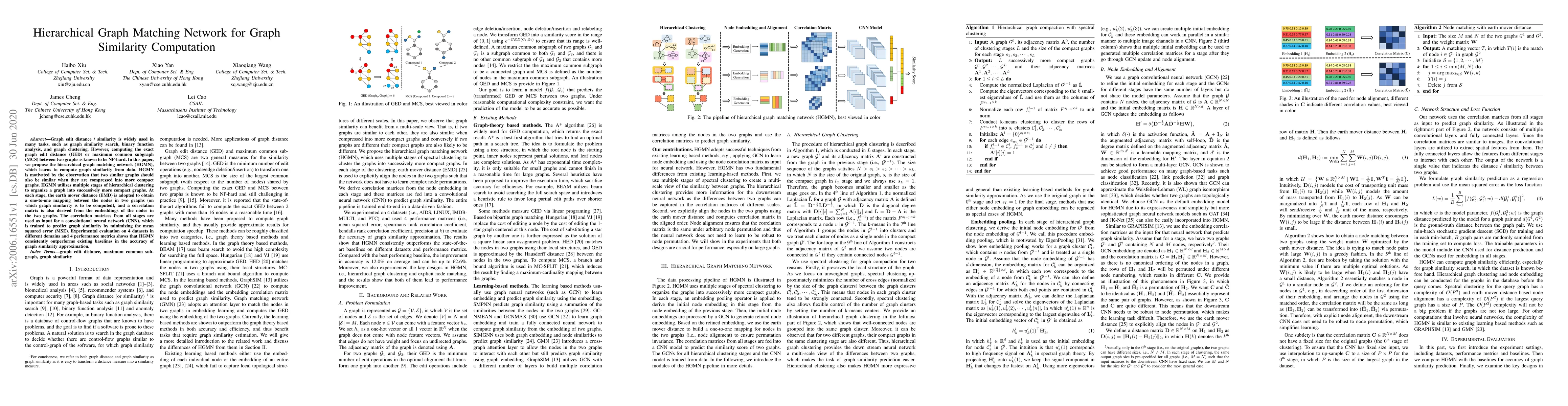 The paper proposes a hierarchical graph matching network (HGMN) to compute graph similarity by learning from data, utilizing hierarchical clustering and convolutional neural networks. HGMN outperforms existing baselines in accuracy across various datasets and metrics.