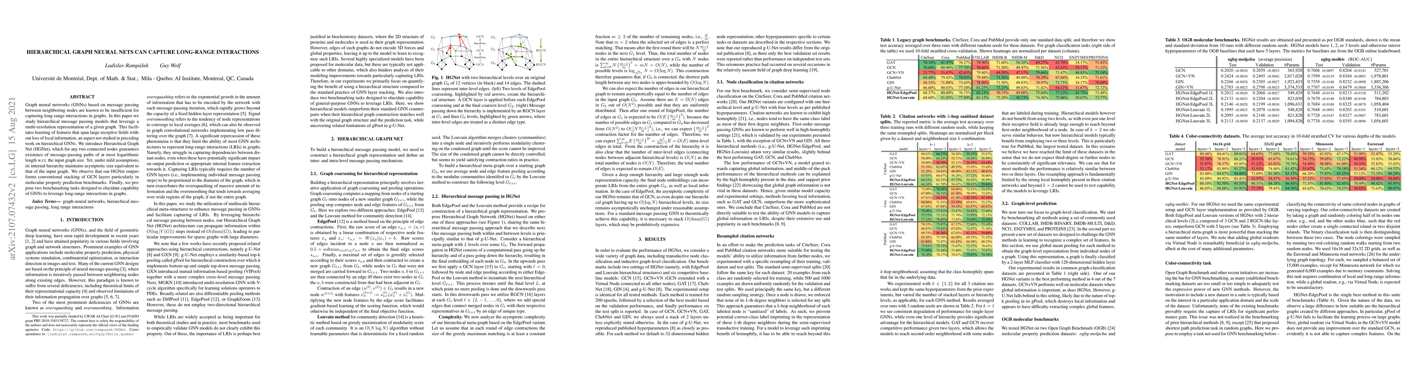 Graph neural networks (GNNs) based on message passing between neighboring nodes are known to be insufficient for capturing long-range interactions in graphs. In this project we study hierarchical message passing models that leverage a multi-resolution representation of a given graph. This facilitates learning of features that span large receptive fields without loss of local information, an aspect not studied in preceding work on hierarchical GNNs. We introduce Hierarchical Graph Net (HGNet), which for any two connected nodes guarantees existence of message-passing paths of at most logarithmic length w.r.t. the input graph size. Yet, under mild assumptions, its internal hierarchy maintains asymptotic size equivalent to that of the input graph. We observe that our HGNet outperforms conventional stacking of GCN layers particularly in molecular property prediction benchmarks. Finally, we propose two benchmarking tasks designed to elucidate capability of GNNs to leverage long-range interactions in graphs.