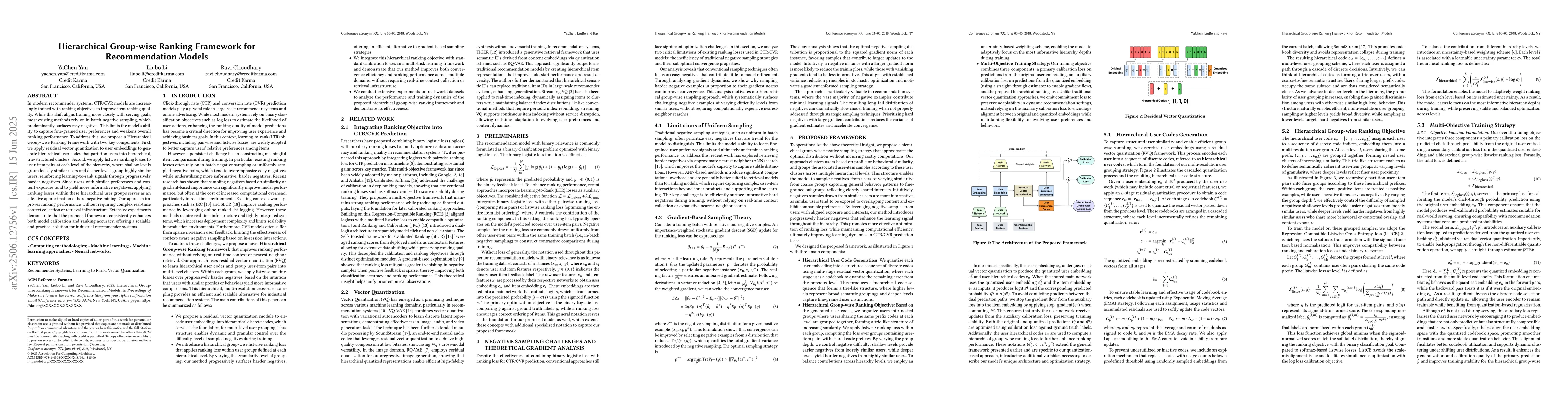 In modern recommender systems, CTR/CVR models are increasingly trained with ranking objectives to improve item ranking quality. While this shift aligns training more closely with serving goals, most existing methods rely on in-batch negative sampling, which predominantly surfaces easy negatives. This limits the model's ability to capture fine-grained user preferences and weakens overall ranking performance. To address this, we propose a Hierarchical Group-wise Ranking Framework with two key components. First, we apply residual vector quantization to user embeddings to generate hierarchical user codes that partition users into hierarchical, trie-structured clusters. Second, we apply listwise ranking losses to user-item pairs at each level of the hierarchy, where shallow levels group loosely similar users and deeper levels group highly similar users, reinforcing learning-to-rank signals through progressively harder negatives. Since users with similar preferences and content exposure tend to yield more informative negatives, applying ranking losses within these hierarchical user groups serves as an effective approximation of hard negative mining. Our approach improves ranking performance without requiring complex real-time context collection or retrieval infrastructure. Extensive experiments demonstrate that the proposed framework consistently enhances both model calibration and ranking accuracy, offering a scalable and practical solution for industrial recommender systems.