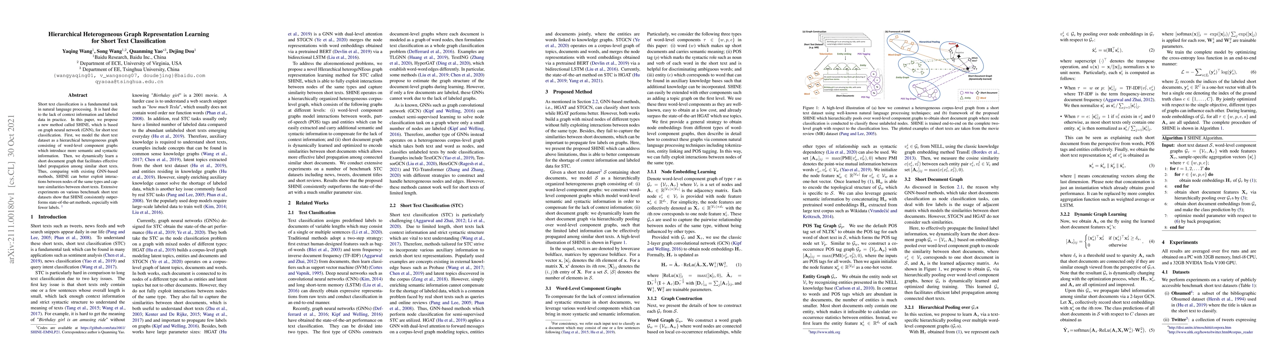 This paper introduces SHINE, a graph neural network-based method for short text classification that models short texts as hierarchical heterogeneous graphs, enhancing semantic and syntactic information. SHINE dynamically learns a document graph to improve label propagation, outperforming existing methods, especially with limited labeled data.