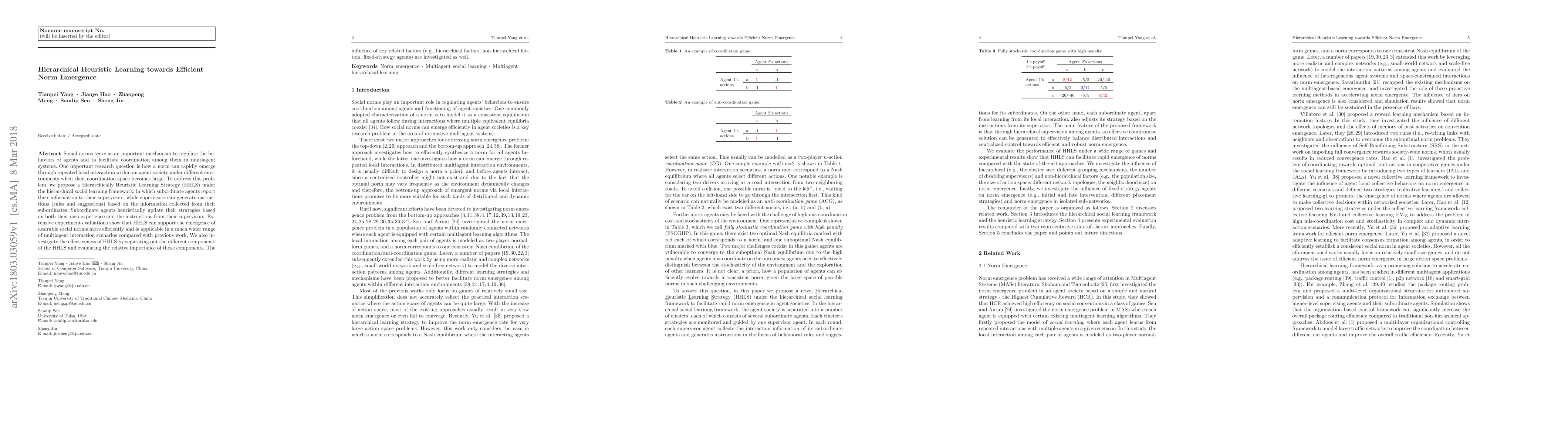 This paper proposes a Hierarchically Heuristic Learning Strategy (HHLS) to efficiently facilitate the emergence of social norms in multiagent systems. HHLS enables subordinate agents to update their strategies based on both their own experiences and instructions from supervisors, leading to more efficient norm emergence across diverse environments.