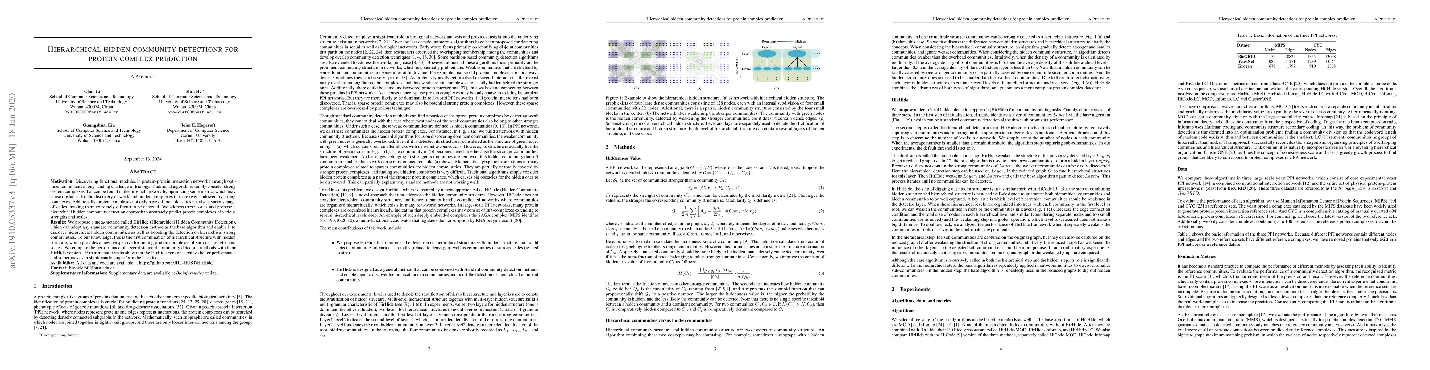 This paper proposes a novel hierarchical hidden community detection method, HirHide, to improve the discovery of protein complexes in protein-protein interaction networks. HirHide combines traditional community detection methods to uncover both hierarchical and hidden complexes, significantly outperforming baseline methods in experimental evaluations.