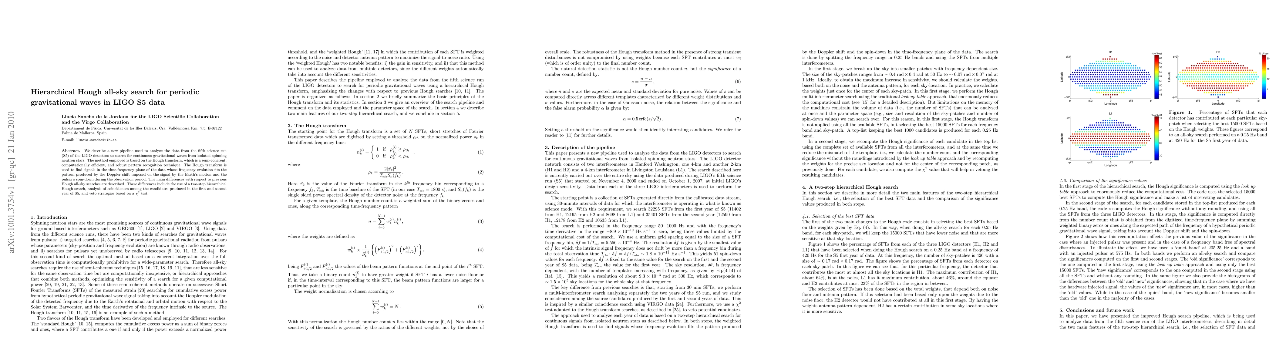 This paper introduces a new pipeline for analyzing LIGO S5 data to detect continuous gravitational waves from isolated spinning neutron stars using a hierarchical Hough transform. The method enhances computational efficiency and robustness, employing a two-step search and $\chi^2$ veto strategies to improve signal detection.