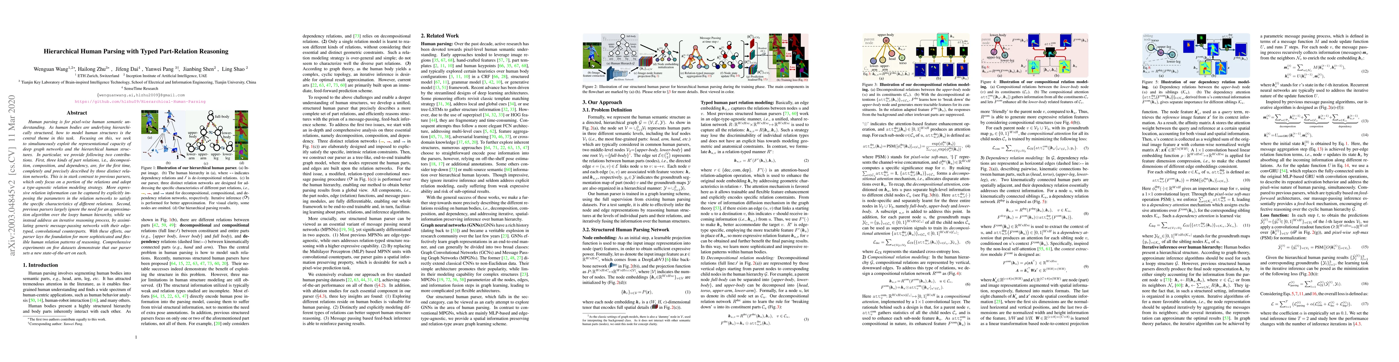 Human parsing is for pixel-wise human semantic understanding. As human bodies are underlying hierarchically structured, how to model human structures is the central theme in this task. Focusing on this, we seek to simultaneously exploit the representational capacity of deep graph networks and the hierarchical human structures. In particular, we provide following two contributions. First, three kinds of part relations, i.e., decomposition, composition, and dependency, are, for the first time, completely and precisely described by three distinct relation networks. This is in stark contrast to previous parsers, which only focus on a portion of the relations and adopt a type-agnostic relation modeling strategy. More expressive relation information can be captured by explicitly imposing the parameters in the relation networks to satisfy the specific characteristics of different relations. Second, previous parsers largely ignore the need for an approximation algorithm over the loopy human hierarchy, while we instead address an iterative reasoning process, by assimilating generic message-passing networks with their edge-typed, convolutional counterparts. With these efforts, our parser lays the foundation for more sophisticated and flexible human relation patterns of reasoning. Comprehensive experiments on five datasets demonstrate that our parser sets a new state-of-the-art on each.