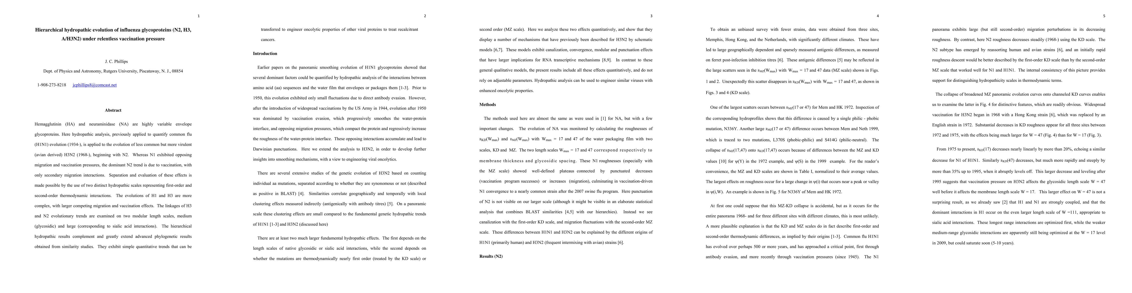 Hemagglutinin (HA) and neuraminidase (NA) are highly variable envelope glycoproteins. Here hydropathic analysis, previously applied to quantify common flu (H1N1) evolution (1934-), is applied to the evolution of less common but more virulent (avian derived) H3N2 (1968-), beginning with N2. Whereas N1 exhibited opposing migration and vaccination pressures, the dominant N2 trend is due to vaccination, with only secondary migration interactions. Separation and evaluation of these effects is made possible by the use of two distinct hydropathic scales representing first-order and second-order thermodynamic interactions. The evolutions of H1 and H3 are more complex, with larger competing migration and vaccination effects. The linkages of H3 and N2 evolutionary trends are examined on two modular length scales, medium (glycosidic) and large (corresponding to sialic acid interactions). The hierarchical hydropathic results complement and greatly extend advanced phylogenetic results obtained from similarity studies. They exhibit simple quantitative trends that can be transferred to engineer oncolytic properties of other viral proteins to treat recalcitrant cancers.
