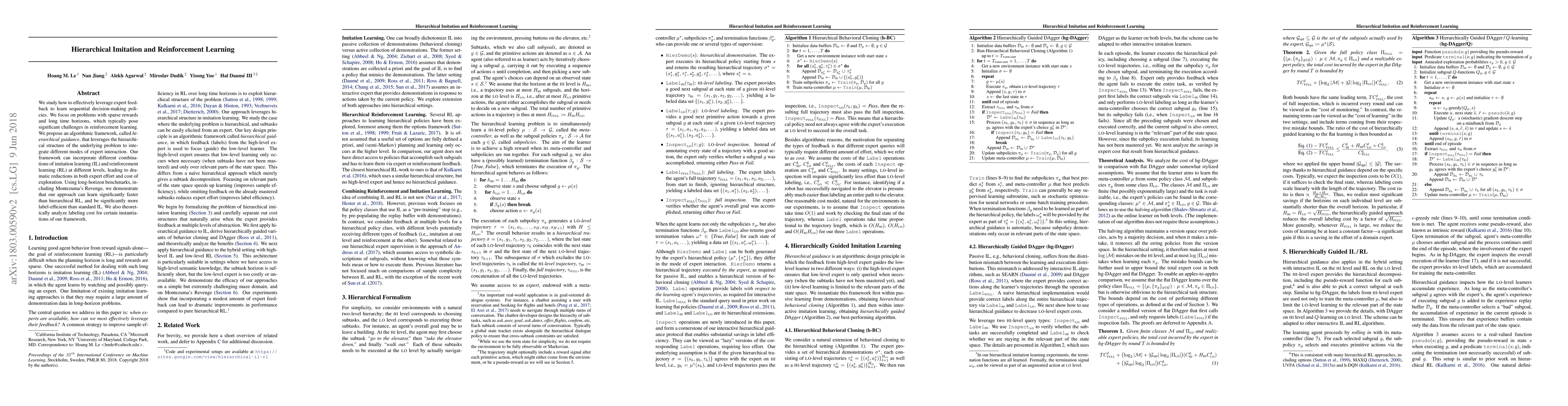 We study how to effectively leverage expert feedback to learn sequential decision-making policies. We focus on problems with sparse rewards and long time horizons, which typically pose significant challenges in reinforcement learning. We propose an algorithmic framework, called hierarchical guidance, that leverages the hierarchical structure of the underlying problem to integrate different modes of expert interaction. Our framework can incorporate different combinations of imitation learning (IL) and reinforcement learning (RL) at different levels, leading to dramatic reductions in both expert effort and cost of exploration. Using long-horizon benchmarks, including Montezuma's Revenge, we demonstrate that our approach can learn significantly faster than hierarchical RL, and be significantly more label-efficient than standard IL. We also theoretically analyze labeling cost for certain instantiations of our framework.