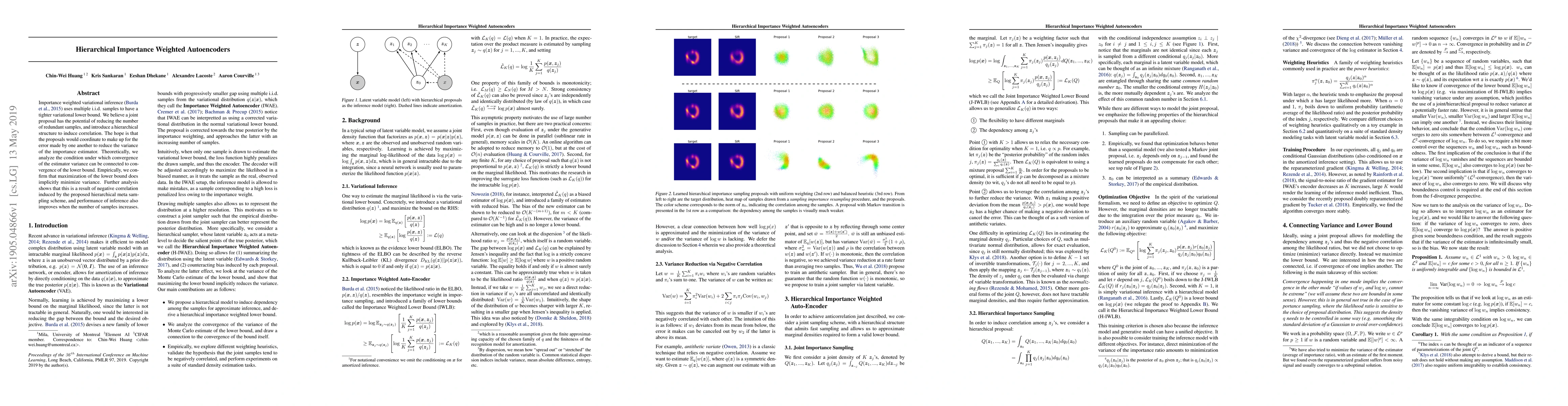 This paper introduces hierarchical importance weighted autoencoders to reduce redundant samples in variational inference. The proposed hierarchical structure aims to induce correlation among samples, which helps to minimize the variance of the importance estimator and improve inference performance.