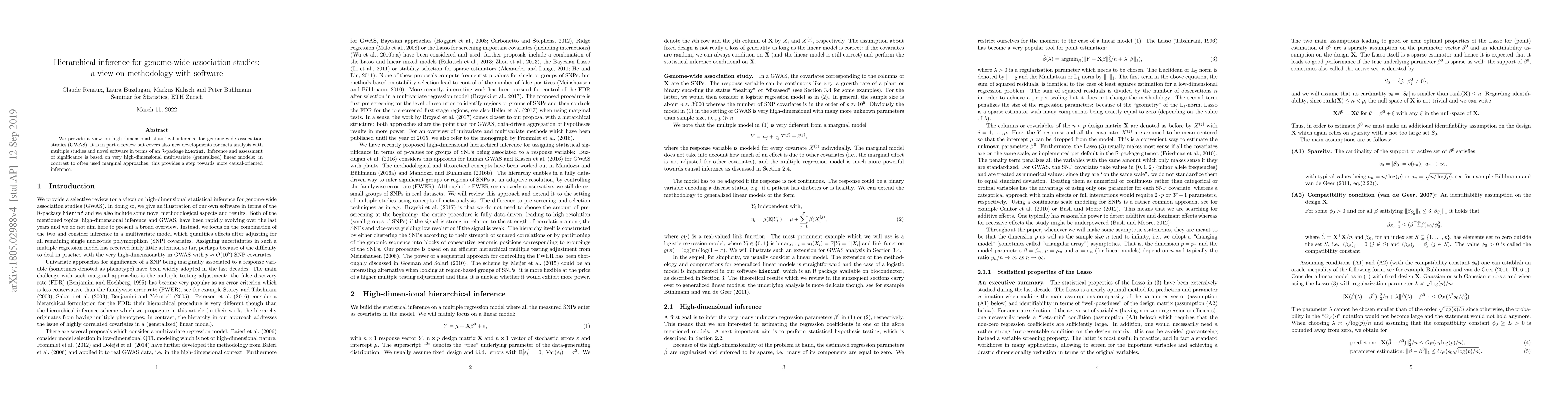 This paper reviews high-dimensional statistical methods for genome-wide association studies (GWAS), emphasizing hierarchical inference and introducing new developments for meta-analysis. It also presents a novel R-package, hierinf, for implementing these methods based on high-dimensional multivariate linear models for more causal-oriented inference.
