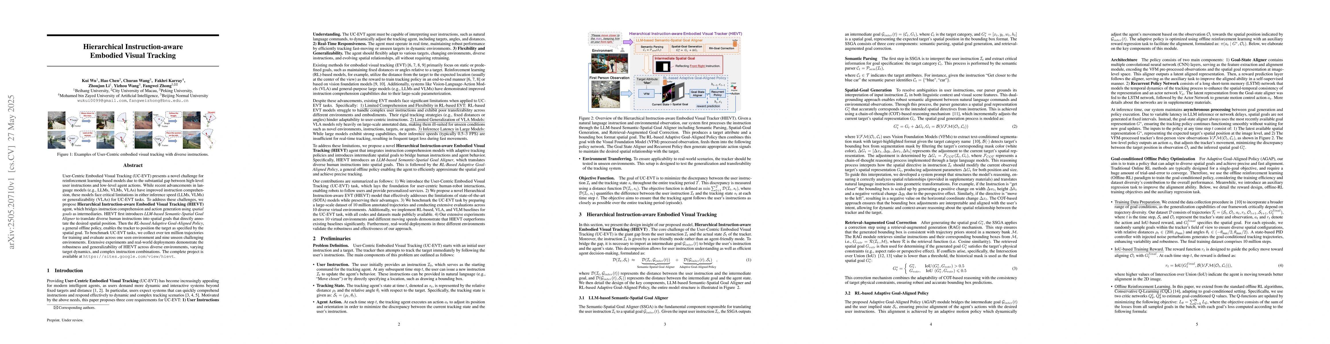 The research proposes Hierarchical Instruction-aware Embodied Visual Tracking (HIEVT) agent that uses a LLM-based Semantic-Spatial Goal Aligner to translate human instructions into spatial goals, followed by an RL-based Adaptive Goal-Aligned Policy for target positioning. It benchmarks UC-EVT tasks using over ten million trajectories for training and evaluation in both seen and unseen environments.