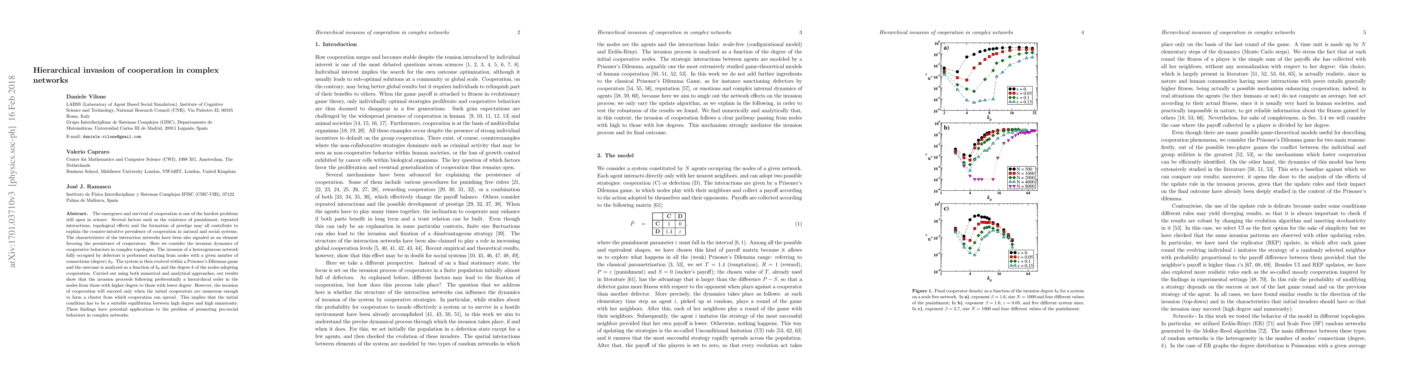 This paper investigates how cooperation spreads in complex networks, finding that it invades hierarchically from high-degree nodes to lower-degree nodes. Successful cooperation requires a sufficient initial number of cooperators to form a spreading cluster, suggesting that promoting cooperation should target high but not excessively high degree nodes.
