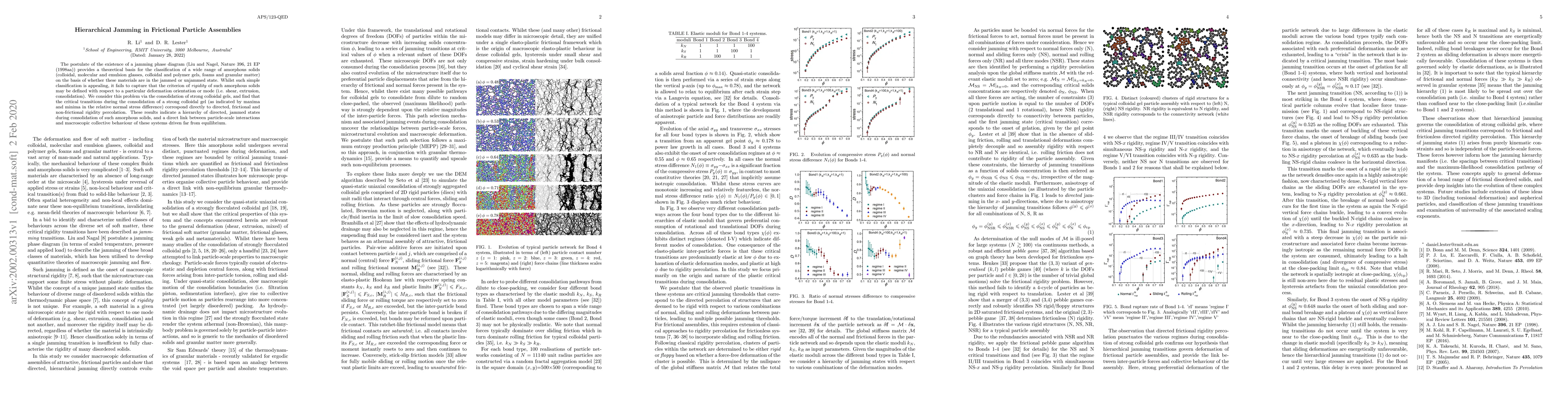 The postulate of the existence of a jamming phase diagram (Liu and Nagel, Nature 396, 21 EP (1998aa)) provides a theoretical basis for the classification of a wide range of amorphous solids (colloidal, molecular and emulsion glasses, colloidal and polymer gels, foams and granular matter) on the basis of whether these materials are in the jammed or unjammed state. Whilst such simple classification is appealing, it fails to capture that the criterion of rigidity of such amorphous solids may be defined with respect to a particular deformation orientation or mode (i.e. shear, extrusion, consolidation). We consider this problem via the consolidation of strong colloidal gels, and find that the critical transitions during the consolidation of a strong colloidal gel (as indicated by maxima and minima in the relative normal stress difference) correspond directly to directed, frictional and non-frictional rigidity percolation. These results indicate a hierarchy of directed, jammed states during consolidation of such amorphous solids, and a direct link between particle-scale interactions and macroscopic collective behaviour of these systems driven far from equilibrium