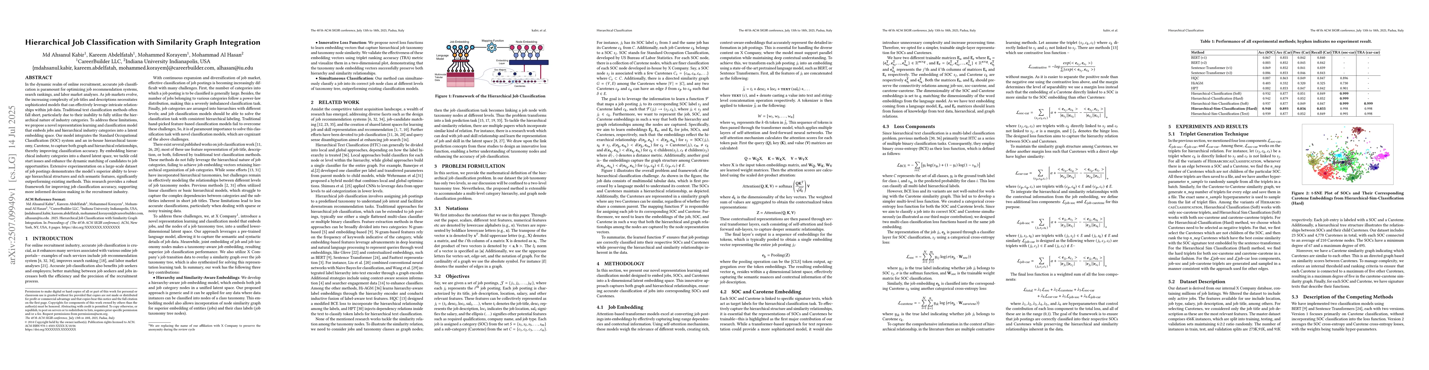 In the dynamic realm of online recruitment, accurate job classification is paramount for optimizing job recommendation systems, search rankings, and labor market analyses. As job markets evolve, the increasing complexity of job titles and descriptions necessitates sophisticated models that can effectively leverage intricate relationships within job data. Traditional text classification methods often fall short, particularly due to their inability to fully utilize the hierarchical nature of industry categories. To address these limitations, we propose a novel representation learning and classification model that embeds jobs and hierarchical industry categories into a latent embedding space. Our model integrates the Standard Occupational Classification (SOC) system and an in-house hierarchical taxonomy, Carotene, to capture both graph and hierarchical relationships, thereby improving classification accuracy. By embedding hierarchical industry categories into a shared latent space, we tackle cold start issues and enhance the dynamic matching of candidates to job opportunities. Extensive experimentation on a large-scale dataset of job postings demonstrates the model's superior ability to leverage hierarchical structures and rich semantic features, significantly outperforming existing methods. This research provides a robust framework for improving job classification accuracy, supporting more informed decision-making in the recruitment industry.