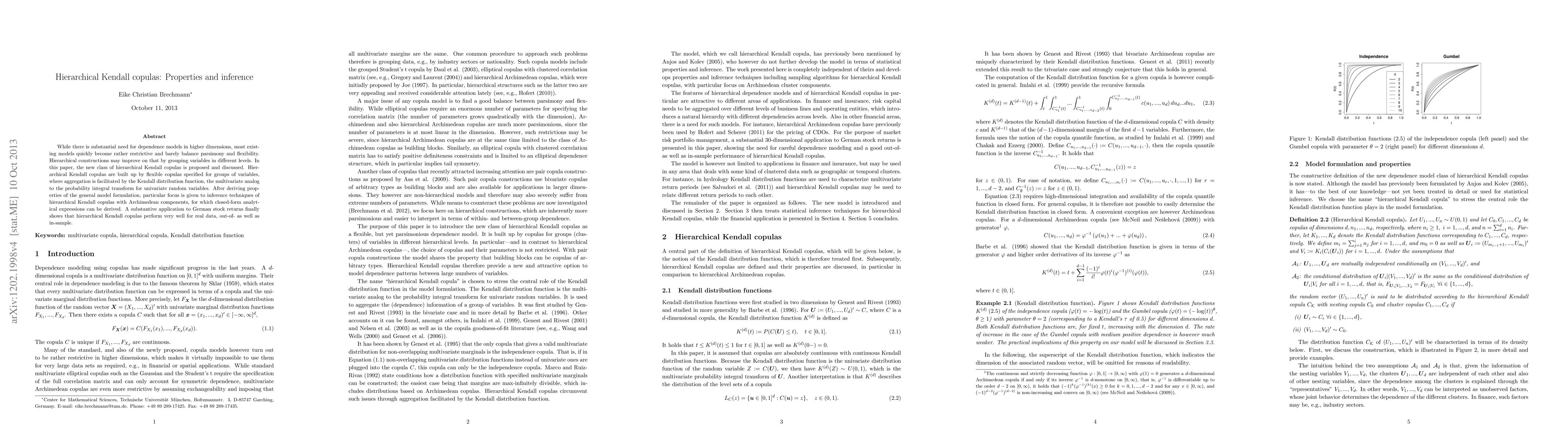 This paper introduces hierarchical Kendall copulas, a flexible dependence model for higher dimensions, constructed by grouping variables in levels. It derives properties of the model and focuses on inference techniques for Archimedean components, demonstrating strong performance on German stock returns data.