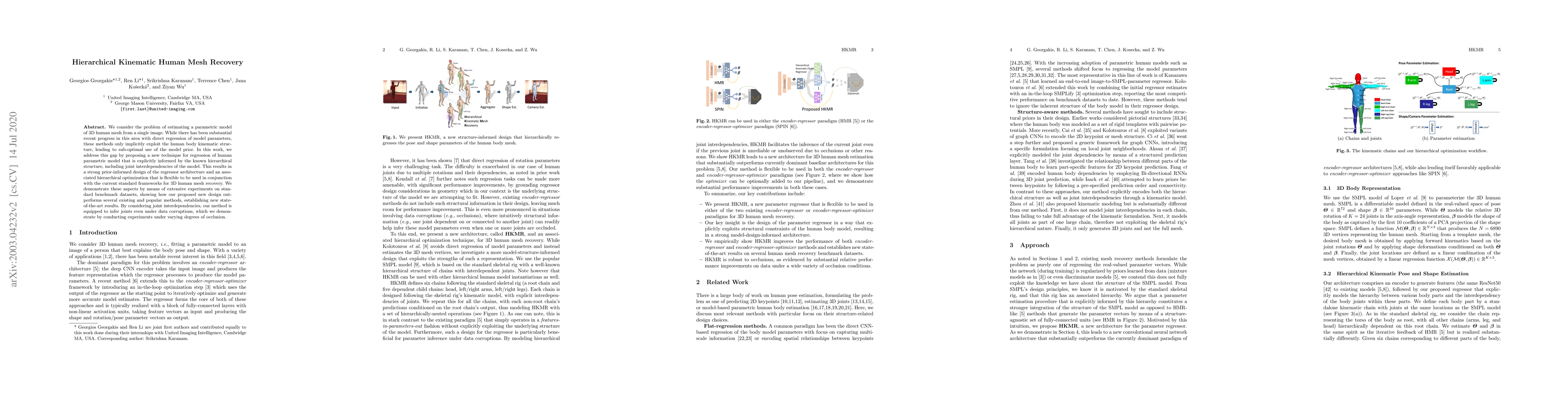 This paper proposes a new technique for estimating a 3D human mesh model from a single image by explicitly incorporating the hierarchical kinematic structure of the human body, leading to improved performance over traditional methods. The approach achieves state-of-the-art results on benchmark datasets and demonstrates robustness under occlusions.