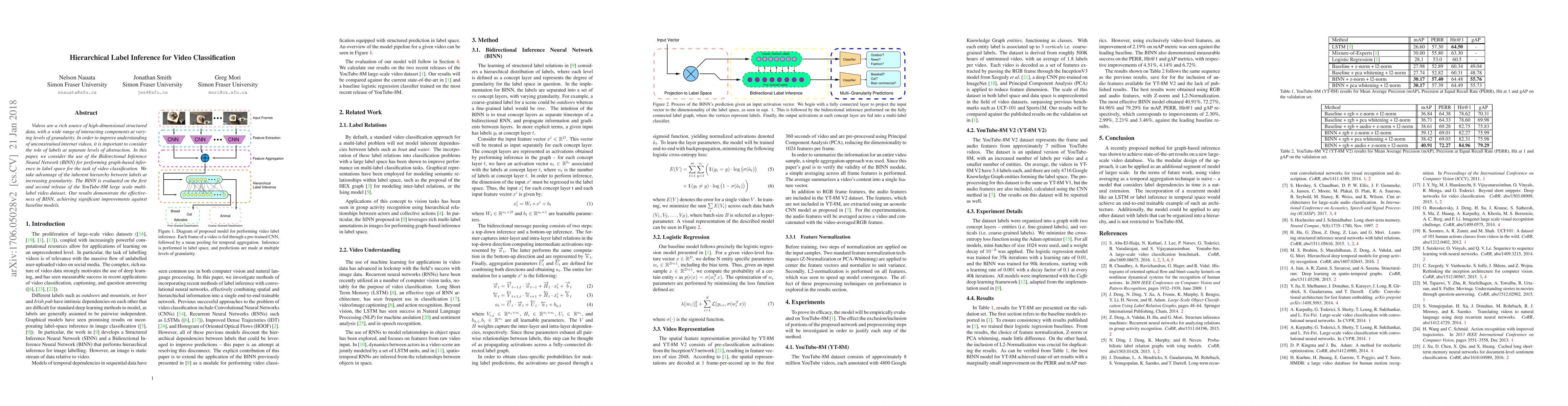 The paper proposes the Bidirectional Inference Neural Network (BINN) for video classification, leveraging a hierarchical structure of labels. BINN uses a bidirectional RNN to propagate information and gradients between concept layers of varying granularity. It's trained end-to-end with backpropagation, minimizing logistic cross-entropy loss.