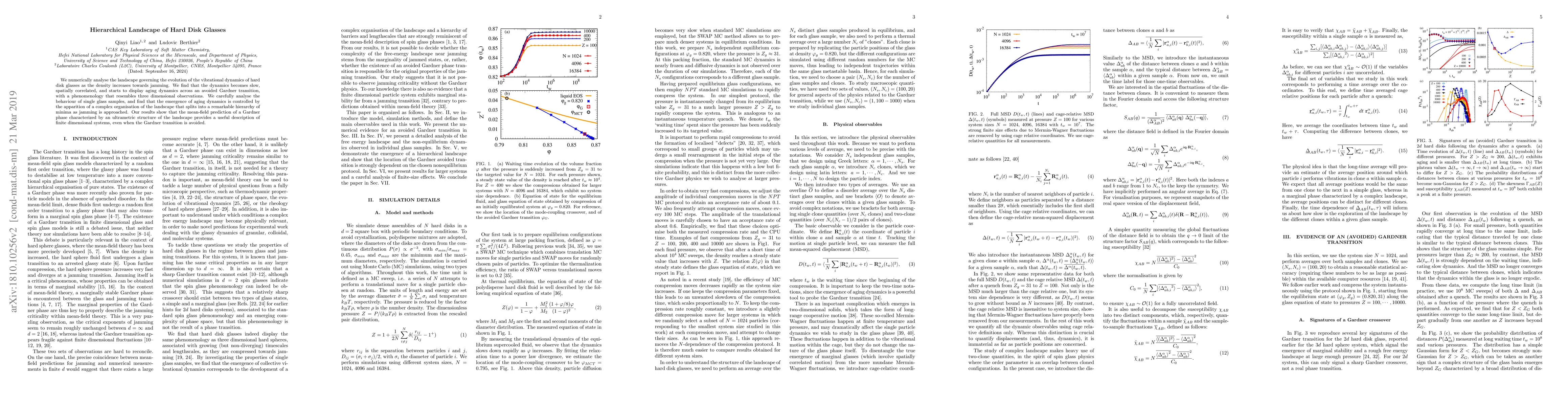 This paper numerically investigates the vibrational dynamics of hard disk glasses as density approaches jamming, revealing a complex hierarchical organization of the landscape that leads to slow, spatially correlated dynamics and aging phenomena. The study finds that the mean-field prediction of a Gardner phase with an ultrametric structure effectively describes these finite dimensional systems despite an avoided Gardner transition.