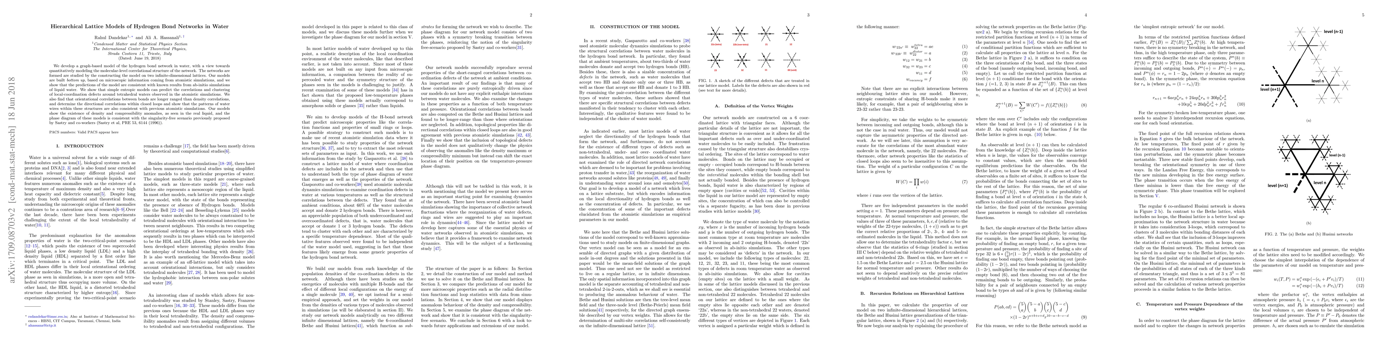 This paper develops a graph-based hierarchical lattice model to quantitatively describe the hydrogen bond network in water, showing consistency with ab-initio simulations. The model reveals entropic predictions of local-coordination defects and orientational correlations, and aligns with observed density and compressibility anomalies in liquid water.
