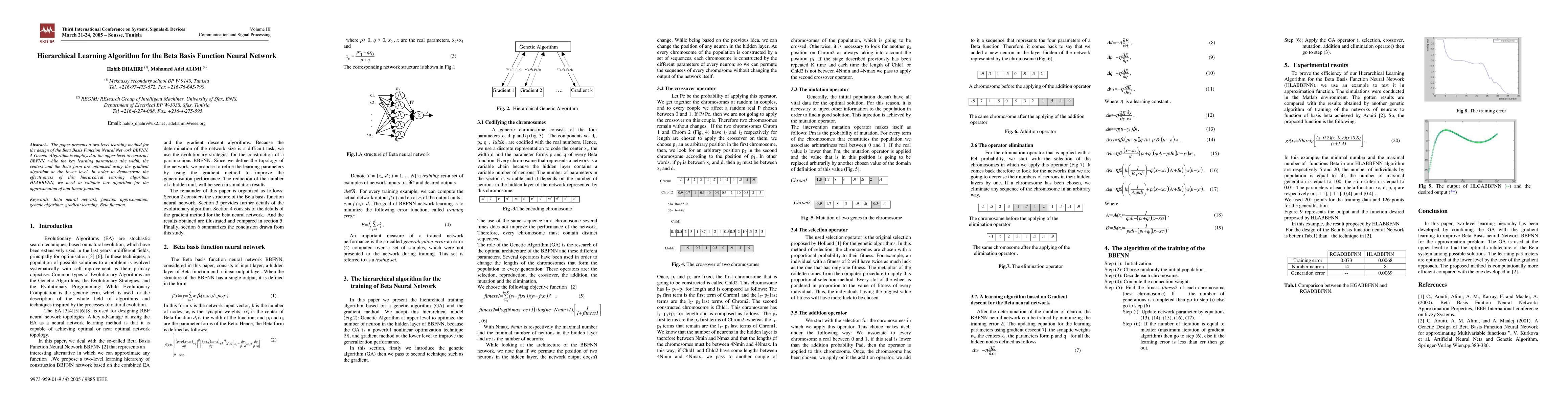 The paper presents a two-level learning method for the design of the Beta Basis Function Neural Network BBFNN. A Genetic Algorithm is employed at the upper level to construct BBFNN, while the key learning parameters :the width, the centers and the Beta form are optimised using the gradient algorithm at the lower level. In order to demonstrate the effectiveness of this hierarchical learning algorithm HLABBFNN, we need to validate our algorithm for the approximation of non-linear function.