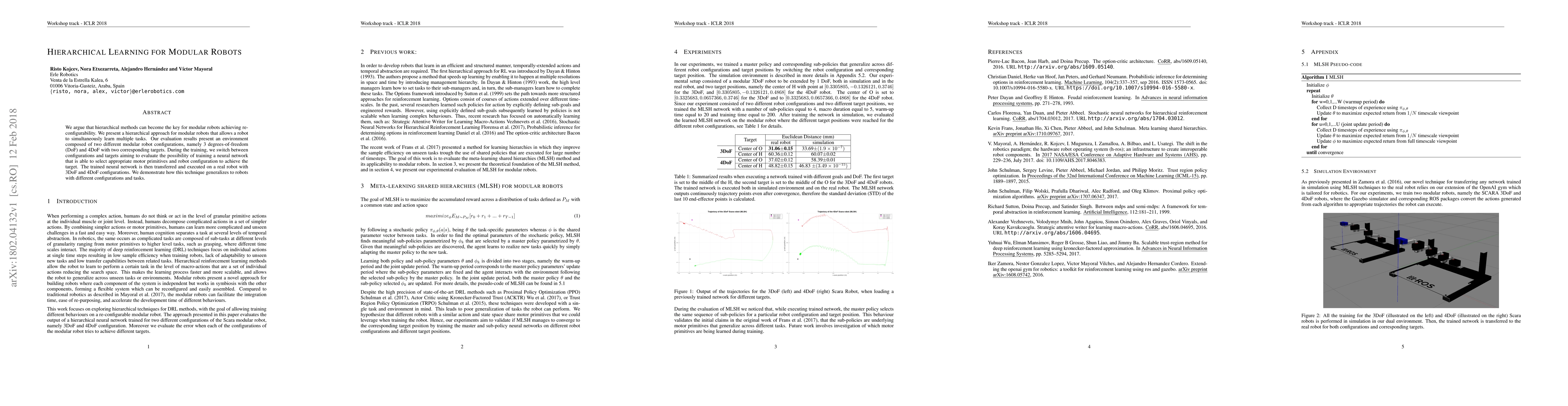We argue that hierarchical methods can become the key for modular robots achieving reconfigurability. We present a hierarchical approach for modular robots that allows a robot to simultaneously learn multiple tasks. Our evaluation results present an environment composed of two different modular robot configurations, namely 3 degrees-of-freedom (DoF) and 4DoF with two corresponding targets. During the training, we switch between configurations and targets aiming to evaluate the possibility of training a neural network that is able to select appropriate motor primitives and robot configuration to achieve the target. The trained neural network is then transferred and executed on a real robot with 3DoF and 4DoF configurations. We demonstrate how this technique generalizes to robots with different configurations and tasks.