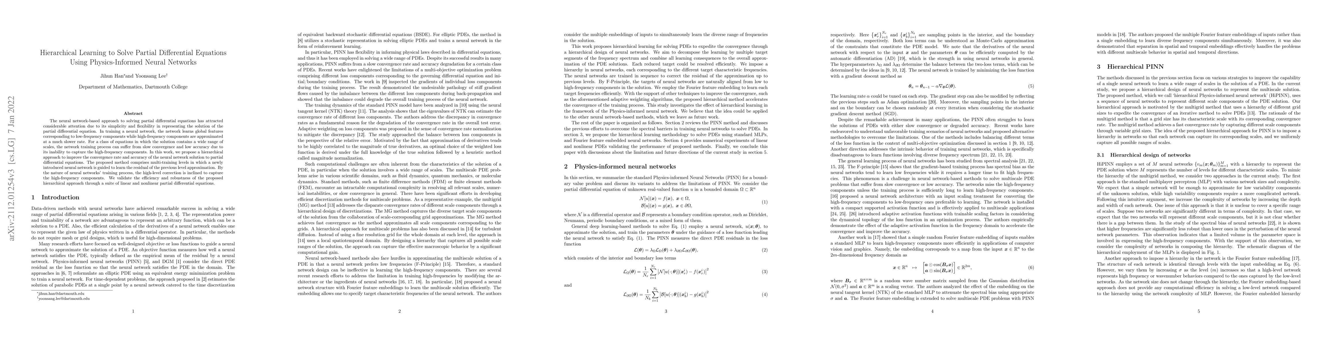This paper proposes a hierarchical learning method using physics-informed neural networks to enhance the solution of partial differential equations, addressing slow convergence and low accuracy due to high-frequency components. The approach involves multi-level training where each level refines the previous approximation, leading to improved convergence and accuracy.