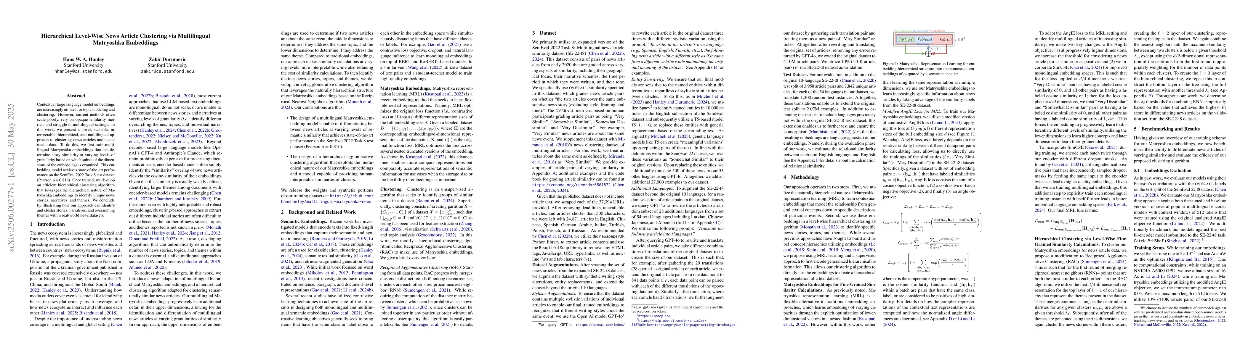 The paper introduces multilingual Matryoshka embeddings, which leverage hierarchical structure to distinguish news articles at varying levels of granularity. A hierarchical clustering approach based on Reciprocal Agglomerative Clustering (RAC) algorithm is proposed to identify individual news stories, narratives, and themes.