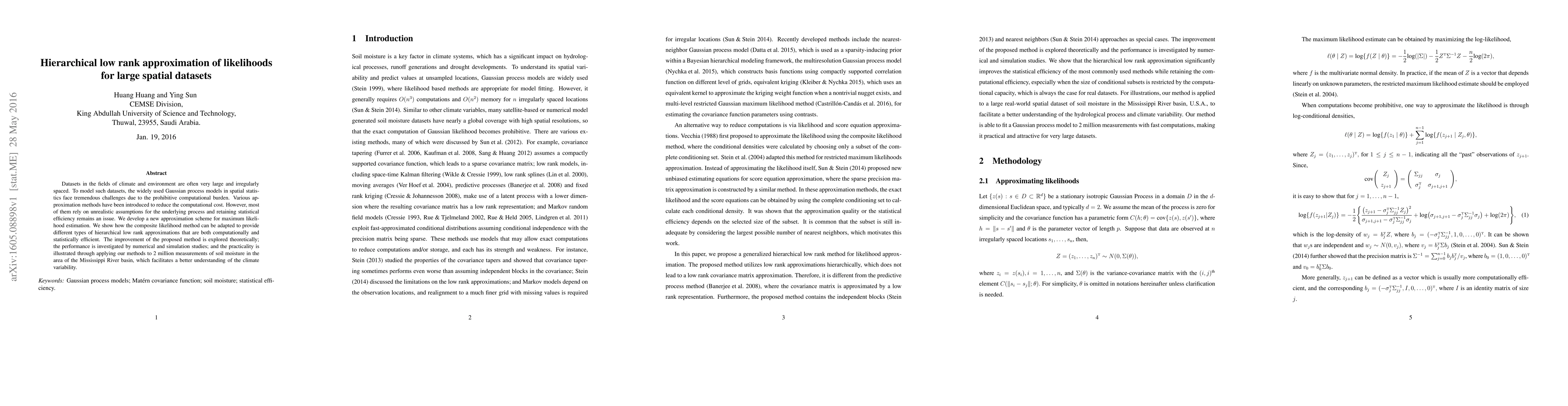 Datasets in the fields of climate and environment are often very large and irregularly spaced. To model such datasets, the widely used Gaussian process models in spatial statis- tics face tremendous challenges due to the prohibitive computational burden. Various ap- proximation methods have been introduced to reduce the computational cost. However, most of them rely on unrealistic assumptions for the underlying process and retaining statistical efficiency remains an issue. We develop a new approximation scheme for maximum likeli- hood estimation. We show how the composite likelihood method can be adapted to provide different types of hierarchical low rank approximations that are both computationally and statistically efficient. The improvement of the proposed method is explored theoretically; the performance is investigated by numerical and simulation studies; and the practicality is illustrated through applying our methods to 2 million measurements of soil moisture in the area of the Mississippi River basin, which facilitates a better understanding of the climate variability.
