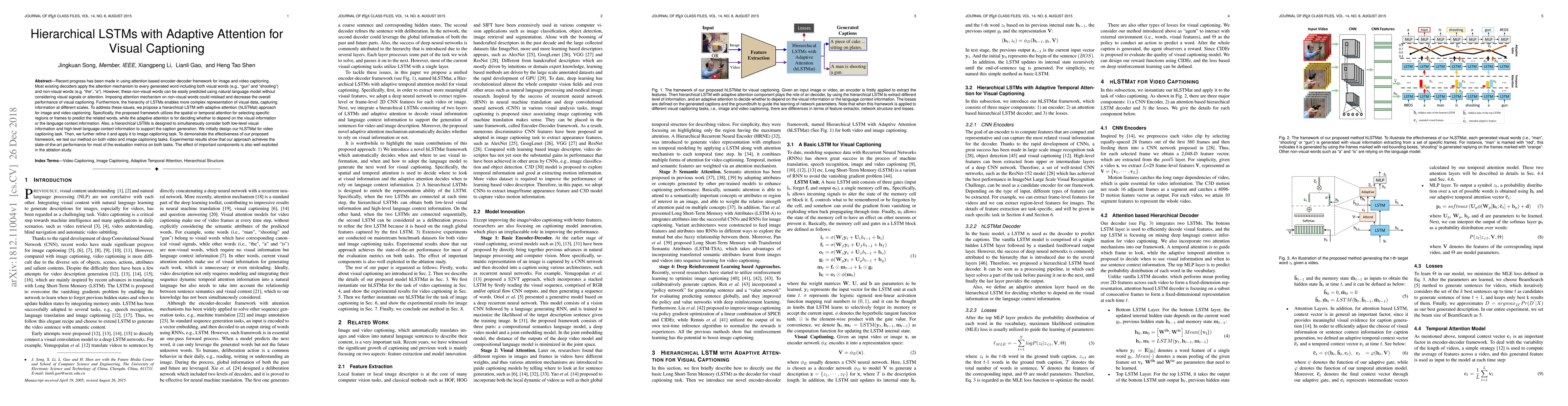 The paper proposes a hierarchical LSTM with adaptive attention (hLSTMat) to improve visual captioning by selectively applying attention to visual words and using hierarchical LSTMs to integrate low-level visual and high-level language context information. The method achieves state-of-the-art performance on both video and image captioning tasks, demonstrating the effectiveness of adaptive attention and hierarchical processing.
