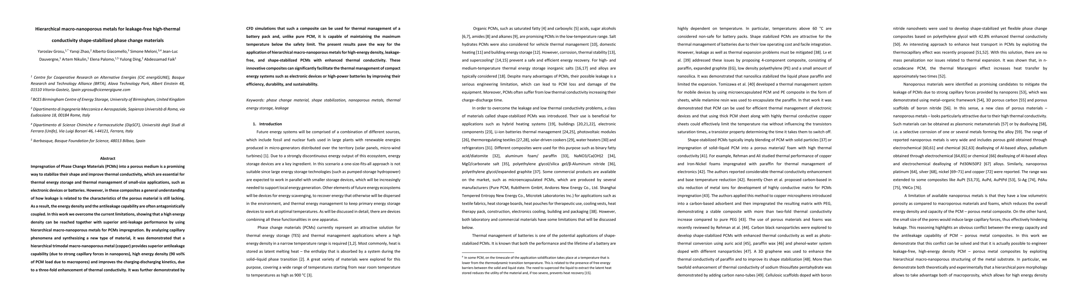 This paper demonstrates the development of hierarchical macro-nanoporous metals to create leakage-free, high-energy density phase change materials (PCMs) for thermal management. The trimodal porous copper structure enhances thermal conductivity and prevents PCM leakage, achieving superior thermal energy storage for applications like electronic devices and batteries.