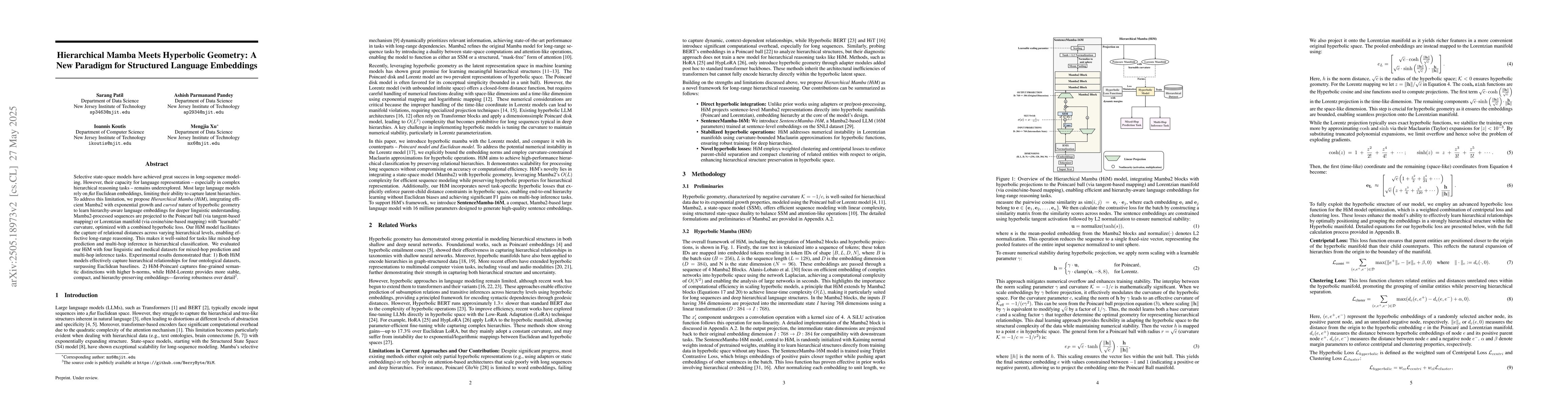 The paper introduces Hierarchical Mamba (HiM), a model that combines Mamba2 with hyperbolic geometry to create language embeddings capable of understanding complex hierarchical structures. HiM outperforms Euclidean models in tasks requiring deep linguistic understanding, like mixed-hop prediction and multi-hop inference. It was evaluated on four datasets, demonstrating improved hierarchical relationship capture and fine-grained semantic distinctions.