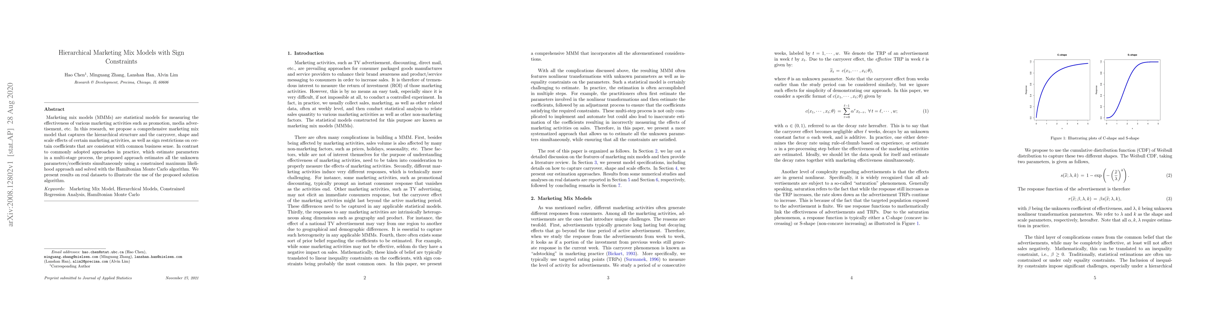 Marketing mix models (MMMs) are statistical models for measuring the effectiveness of various marketing activities such as promotion, media advertisement, etc. In this research, we propose a comprehensive marketing mix model that captures the hierarchical structure and the carryover, shape and scale effects of certain marketing activities, as well as sign restrictions on certain coefficients that are consistent with common business sense. In contrast to commonly adopted approaches in practice, which estimate parameters in a multi-stage process, the proposed approach estimates all the unknown parameters/coefficients simultaneously using a constrained maximum likelihood approach and solved with the Hamiltonian Monte Carlo algorithm. We present results on real datasets to illustrate the use of the proposed solution algorithm.