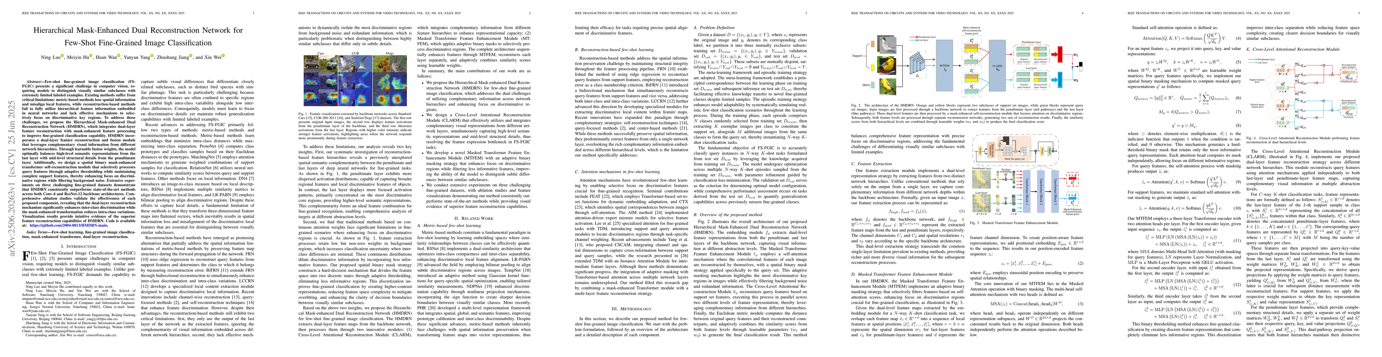 The Hierarchical Mask-enhanced Dual Reconstruction Network (HMDRN) tackles few-shot fine-grained image classification challenges by combining dual-layer feature reconstruction with mask-enhanced feature processing. HMDRN outperforms existing methods by effectively utilizing hierarchical feature information, focusing on discriminative regions, and balancing high-level semantics with mid-level structural details. It has been validated through experiments on three fine-grained datasets, demonstrating improved inter-class discrimination and reduced intra-class variations.