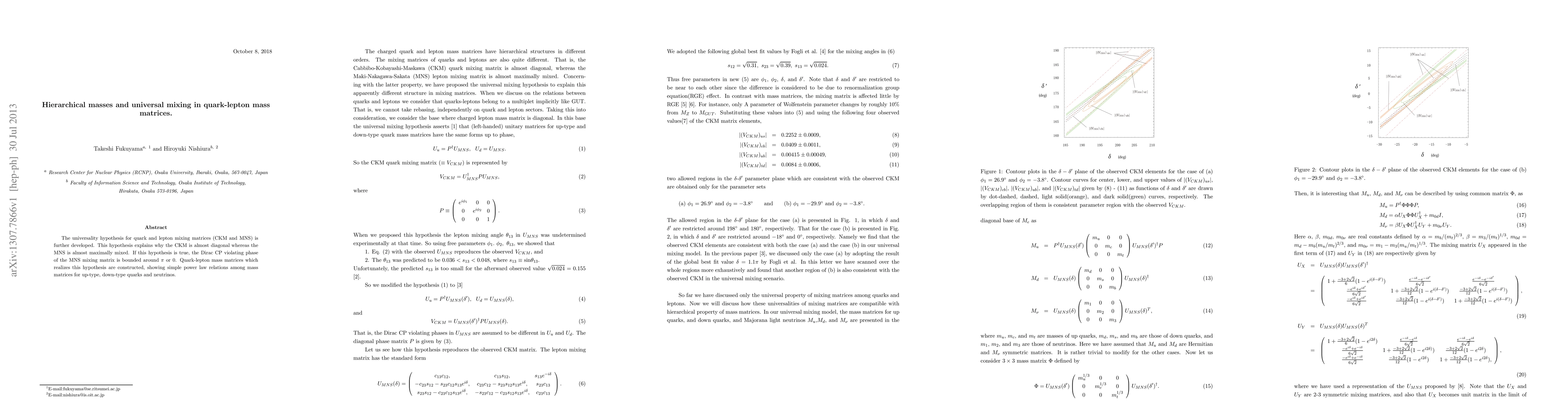 This paper explores the universality hypothesis for quark and lepton mixing matrices, proposing that it explains the differences between the CKM and MNS matrices. It constructs quark-lepton mass matrices that demonstrate simple power law relations, supporting the hypothesis and bounding the Dirac CP violating phase.
