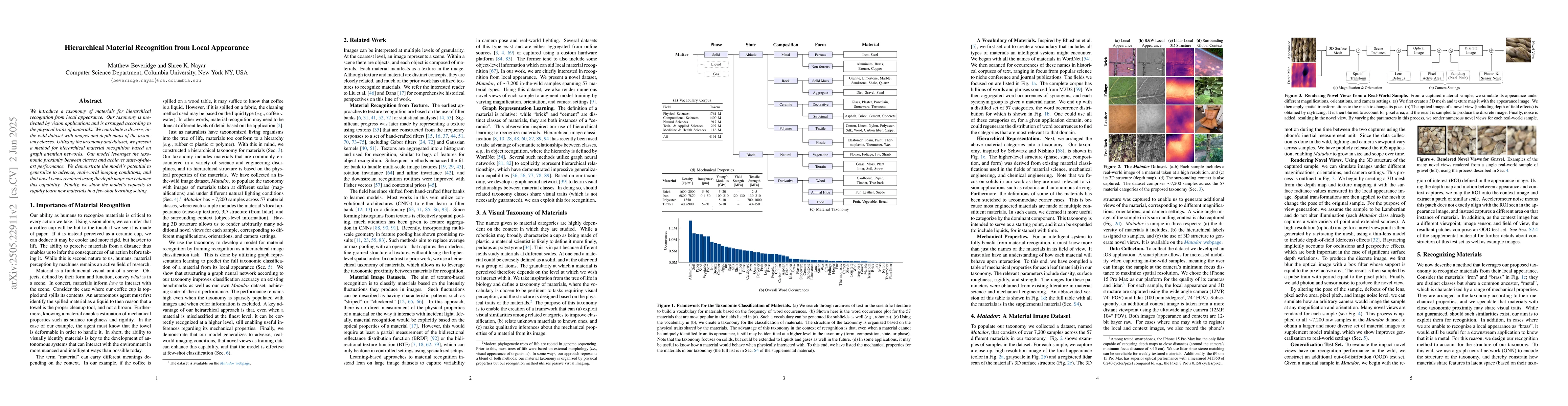 The research introduces a hierarchical material recognition method from local appearance, utilizing a taxonomy based on physical material traits and a dataset of images and depth maps. It employs graph attention networks for recognition, leveraging taxonomic proximity between classes.