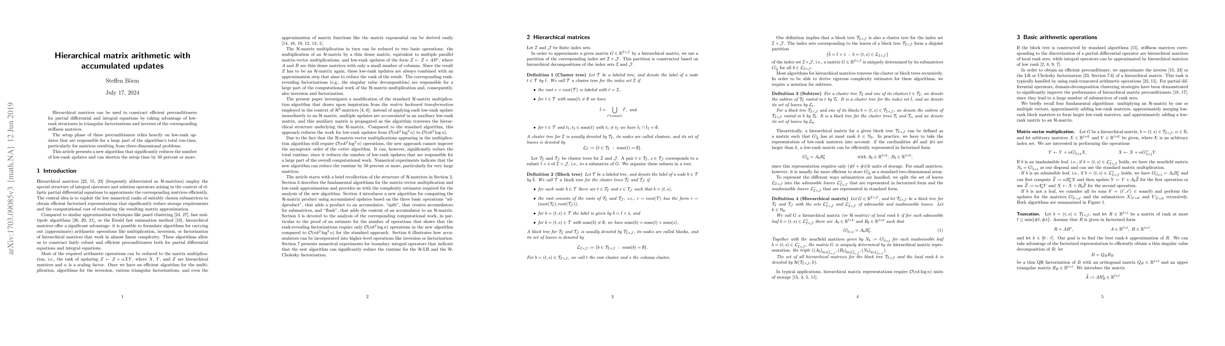 This paper introduces a novel algorithm for hierarchical matrix arithmetic that minimizes low-rank updates, significantly cutting down the setup time for preconditioners used in solving partial differential and integral equations, especially for three-dimensional problems. The new method can reduce setup time by over 50 percent.